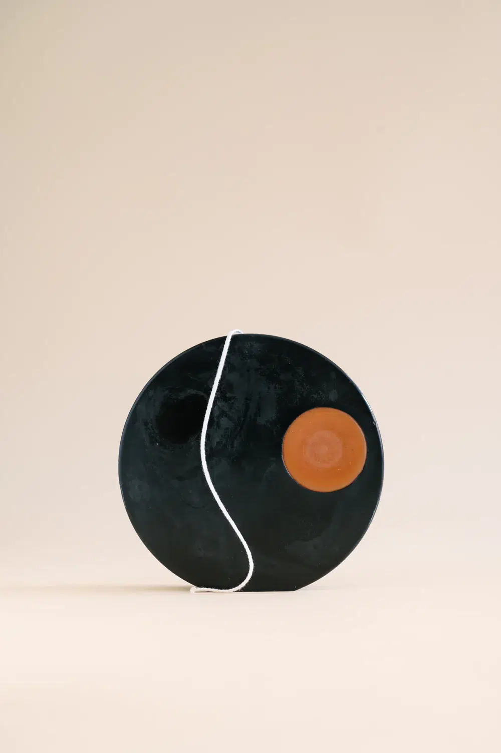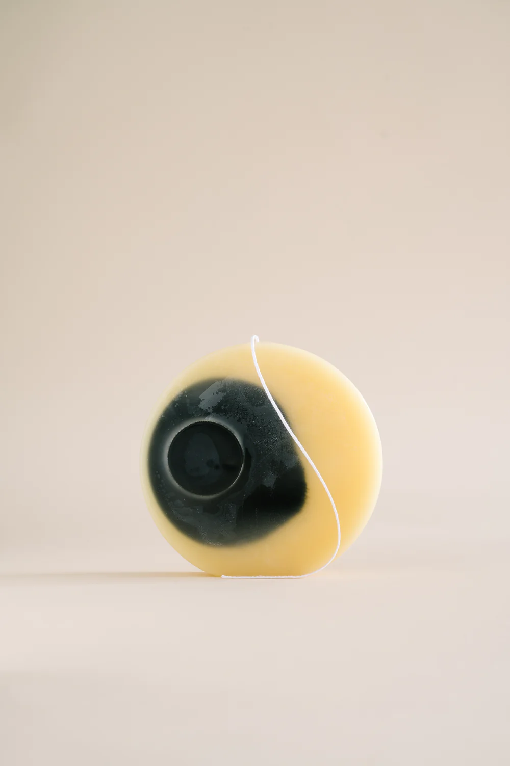 Rundt bivokslys med sirkelmønster i kontrastfarger Tilgjengelig i SOLAR hvit (cera alba) bivoks med midnattskontrastsirkel (indigo) eller LUNAR midnatt, bivoks tilsatt indigo med en rustfarget kontrastsirkel (krapp rot).