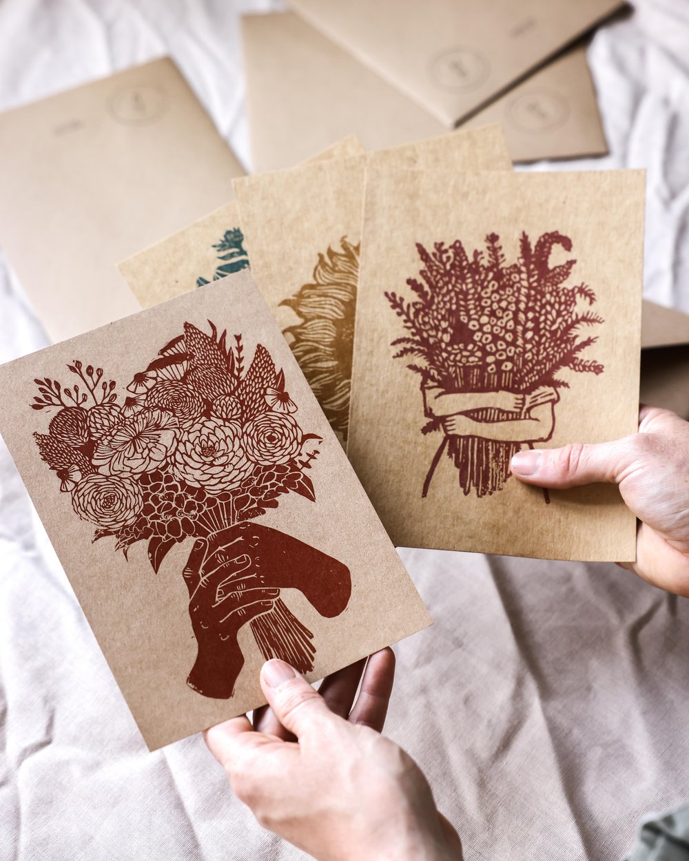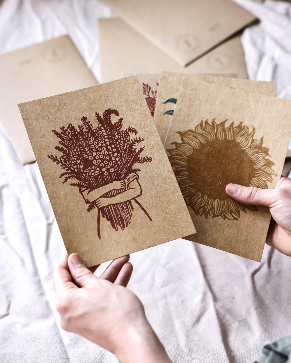 Pakke med 4 A5-postkort, digitaltrykk på brun resirkulert kartong.