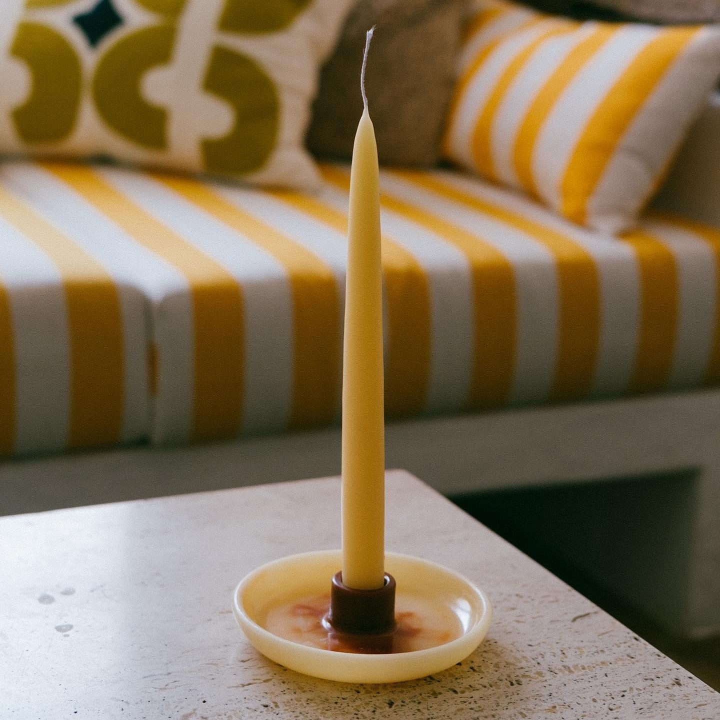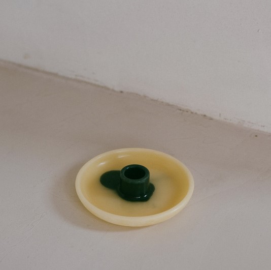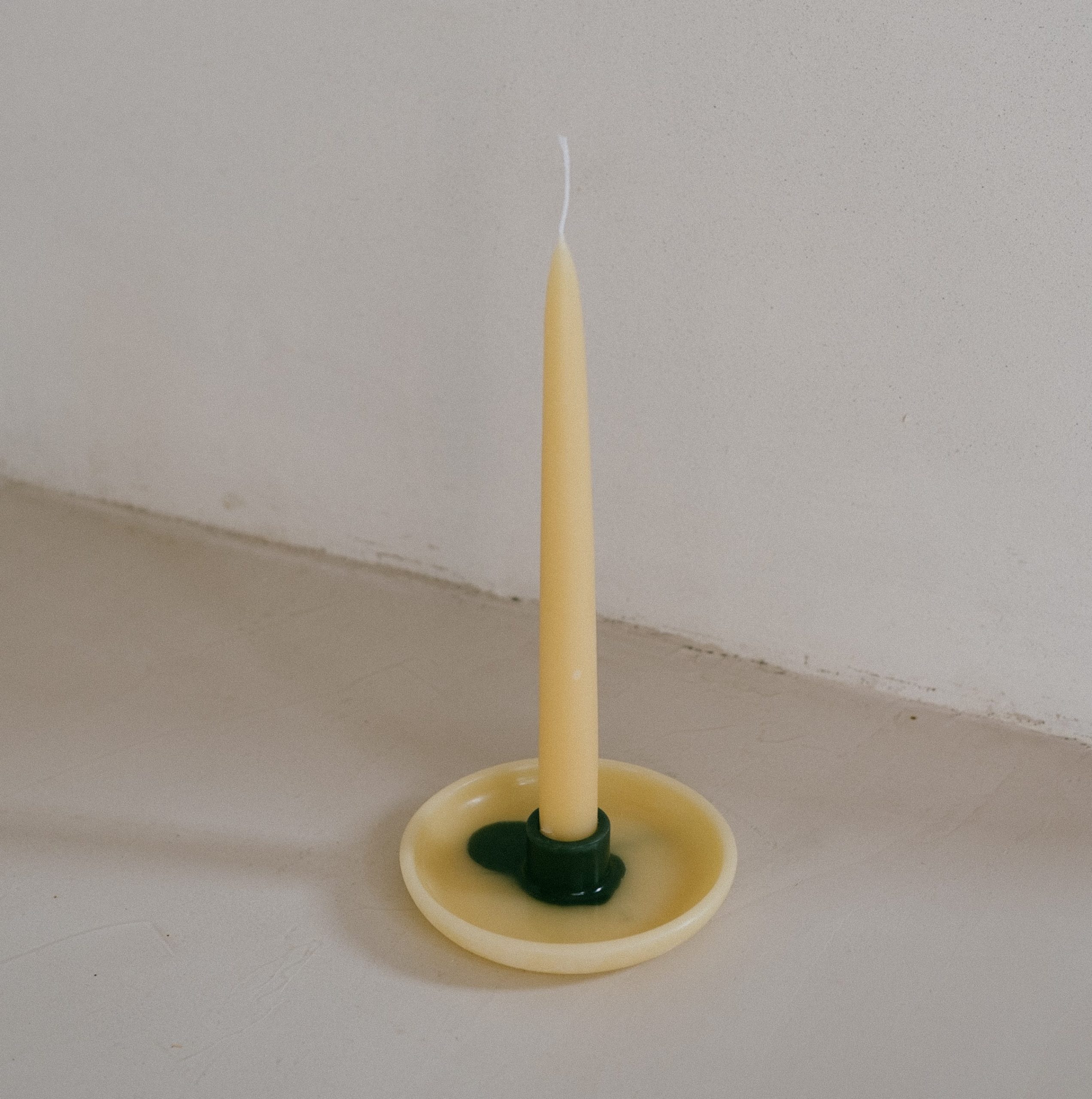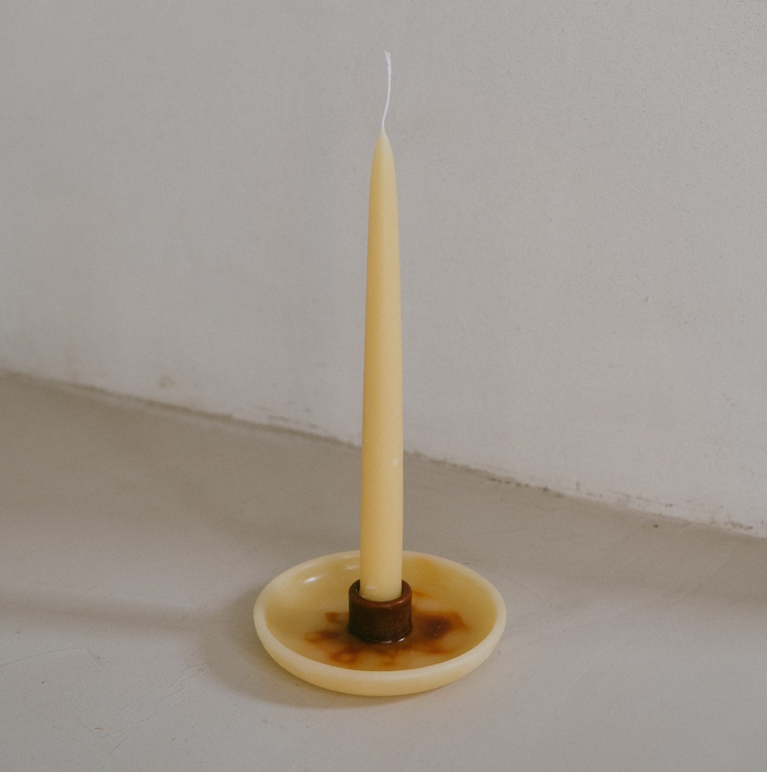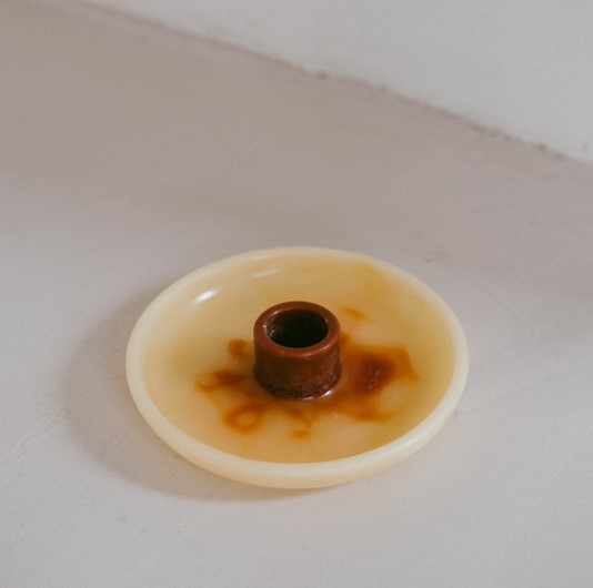 Lysestaker av bivoks laget av cera alba og plantepigmenter. Sentrene er farget med enten krapprot- eller indigopigmenter, og de helles for hånd slik at hver lysestake får et unikt mønster. De har plass til et lys med en diameter på 2 cm, lyset på bildene er ikke inkludert.