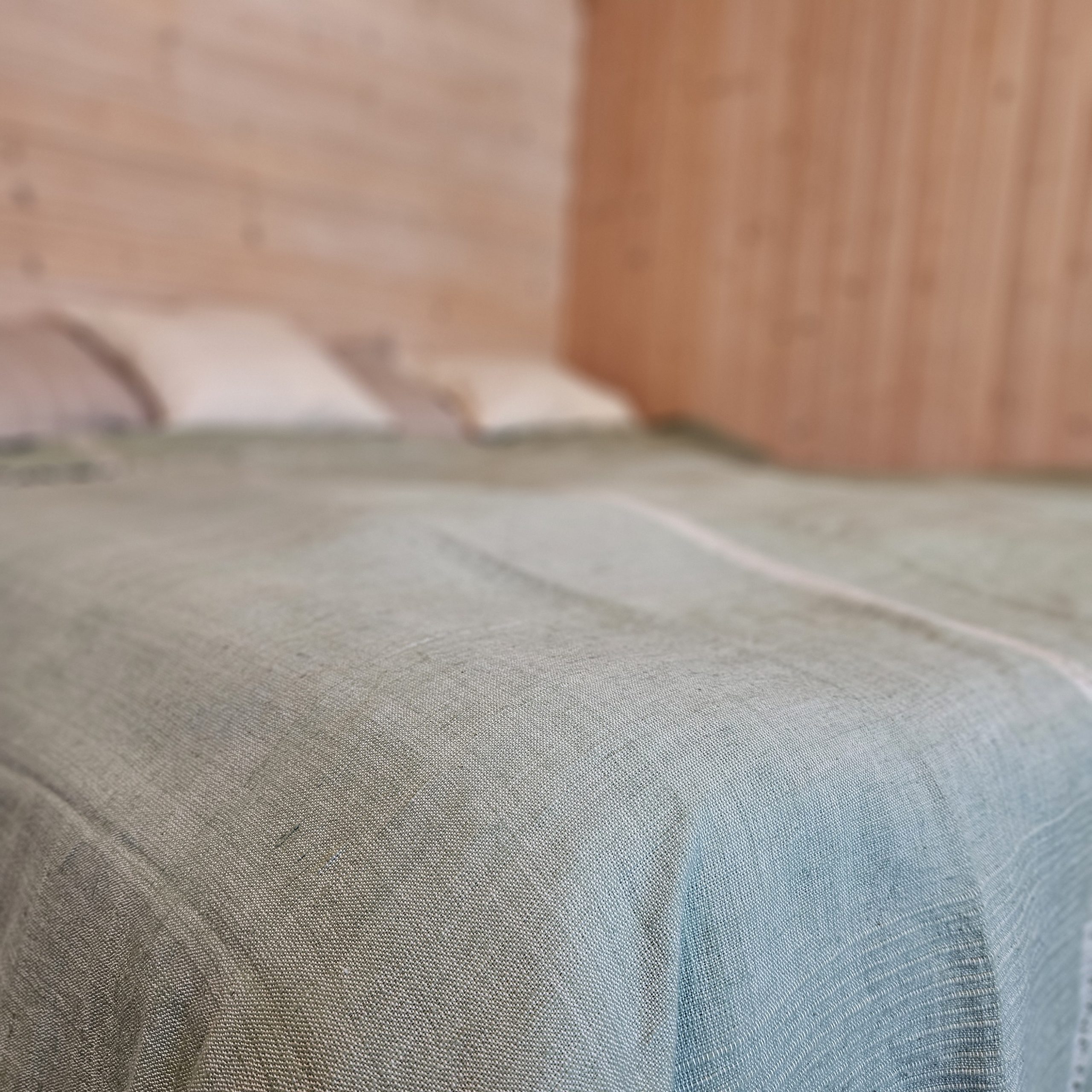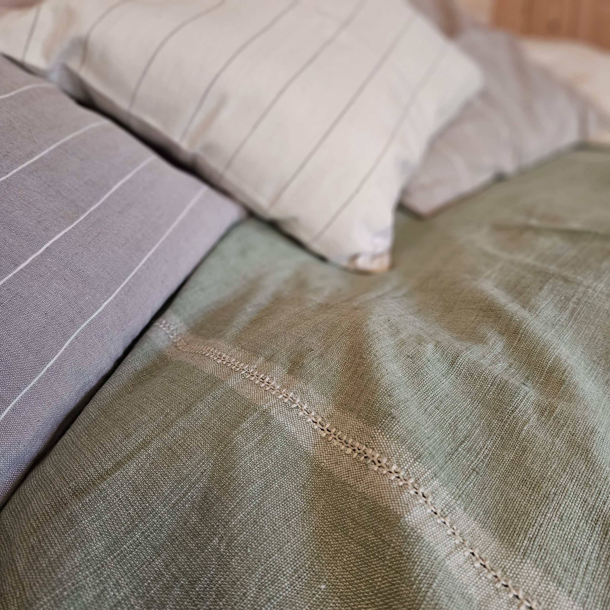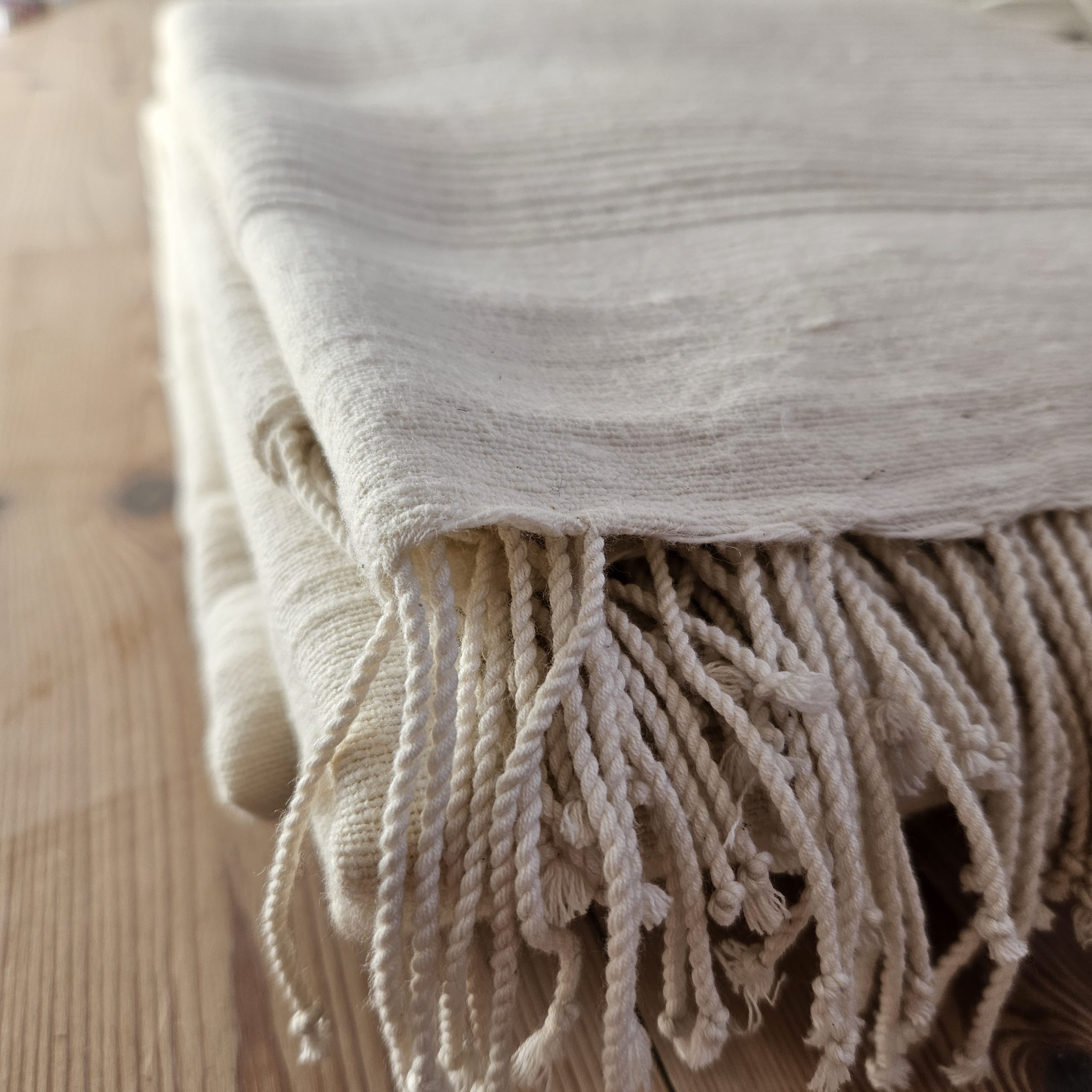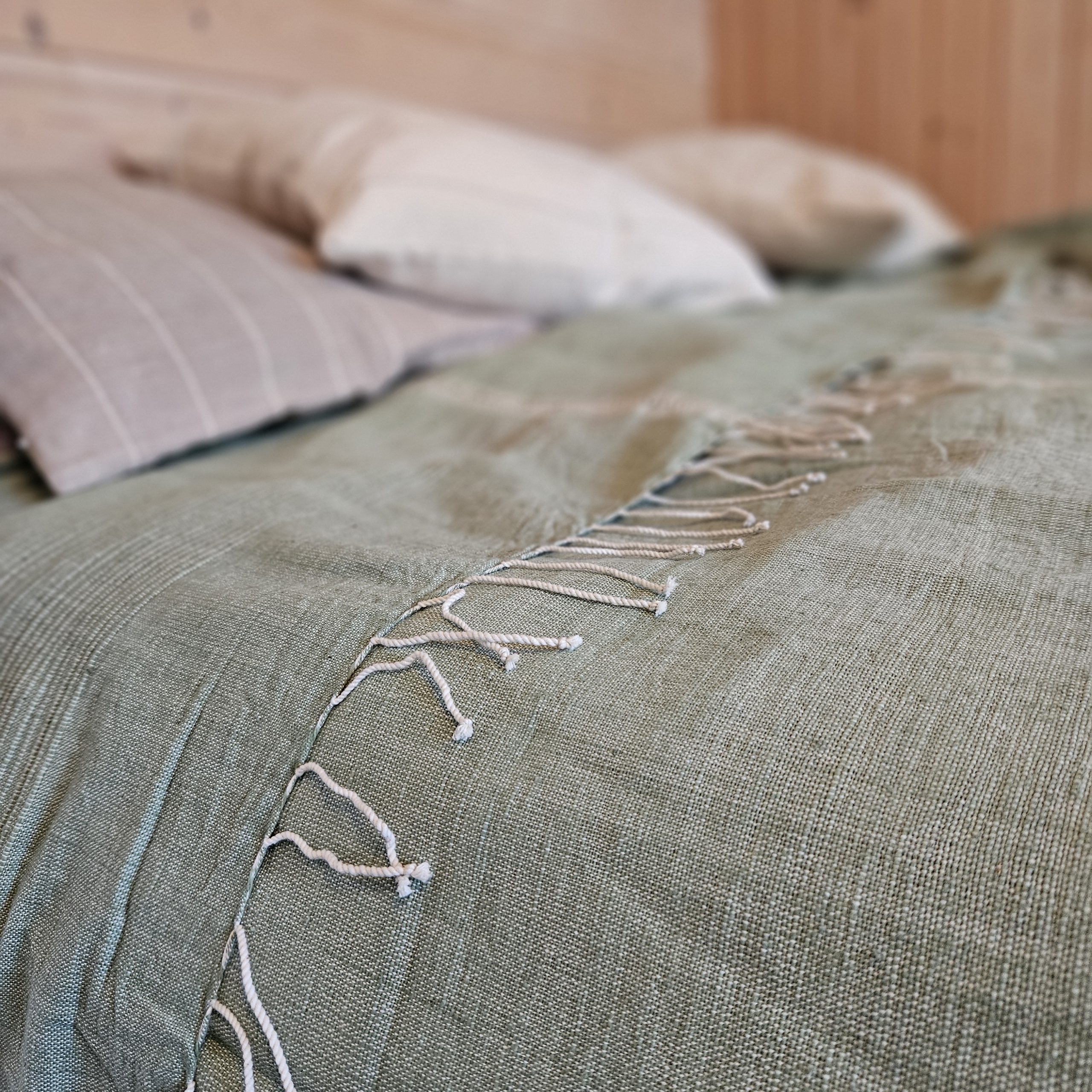 Dette delikate sengeteppe fra Sabahar består av tre paneler sydd sammen for hånd med en tradisjonell kjedesømsteknikk. Finnes for øyeblikket i fargen ivory, naturlig ufarget etiopisk bomull og mint.