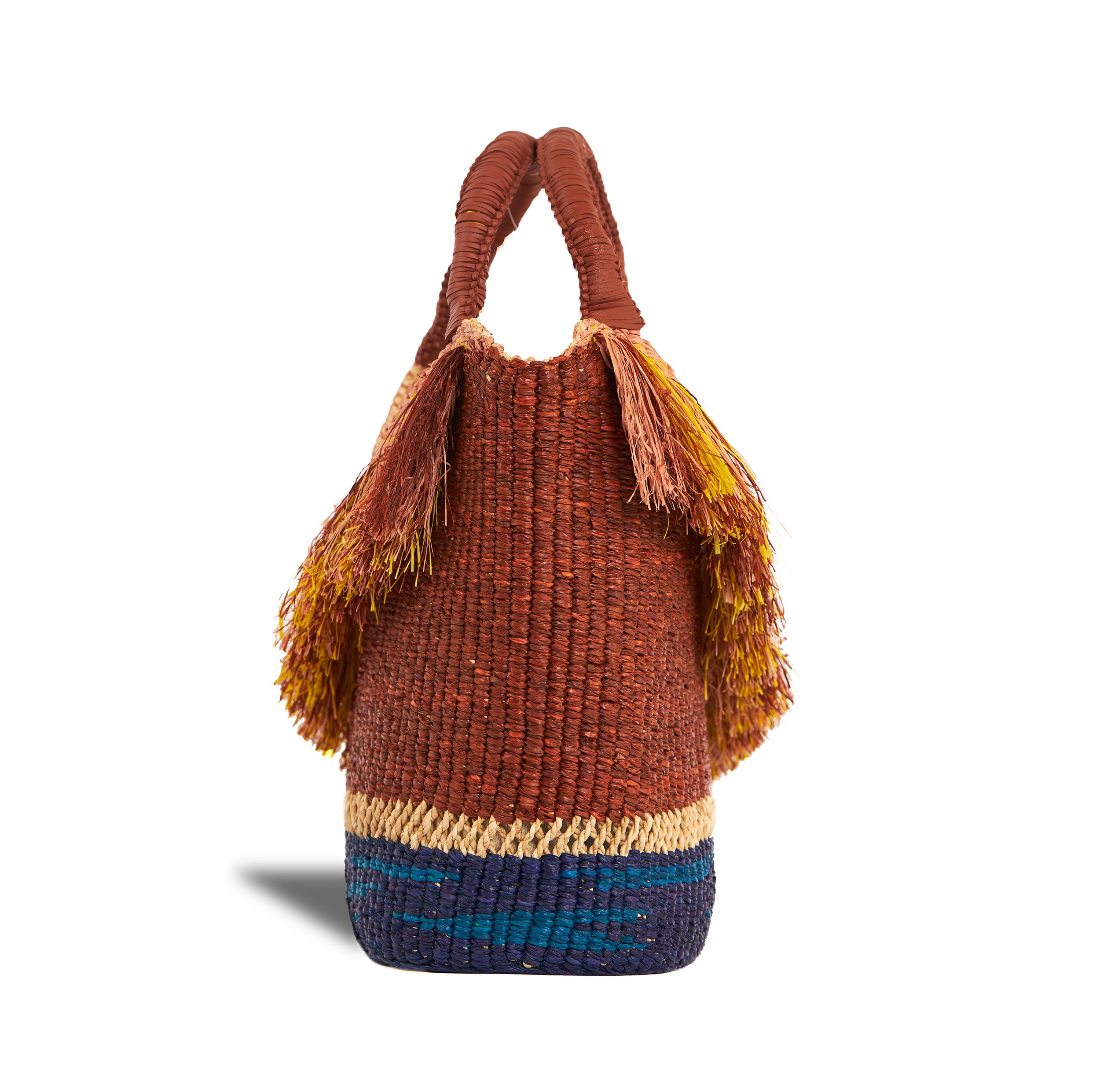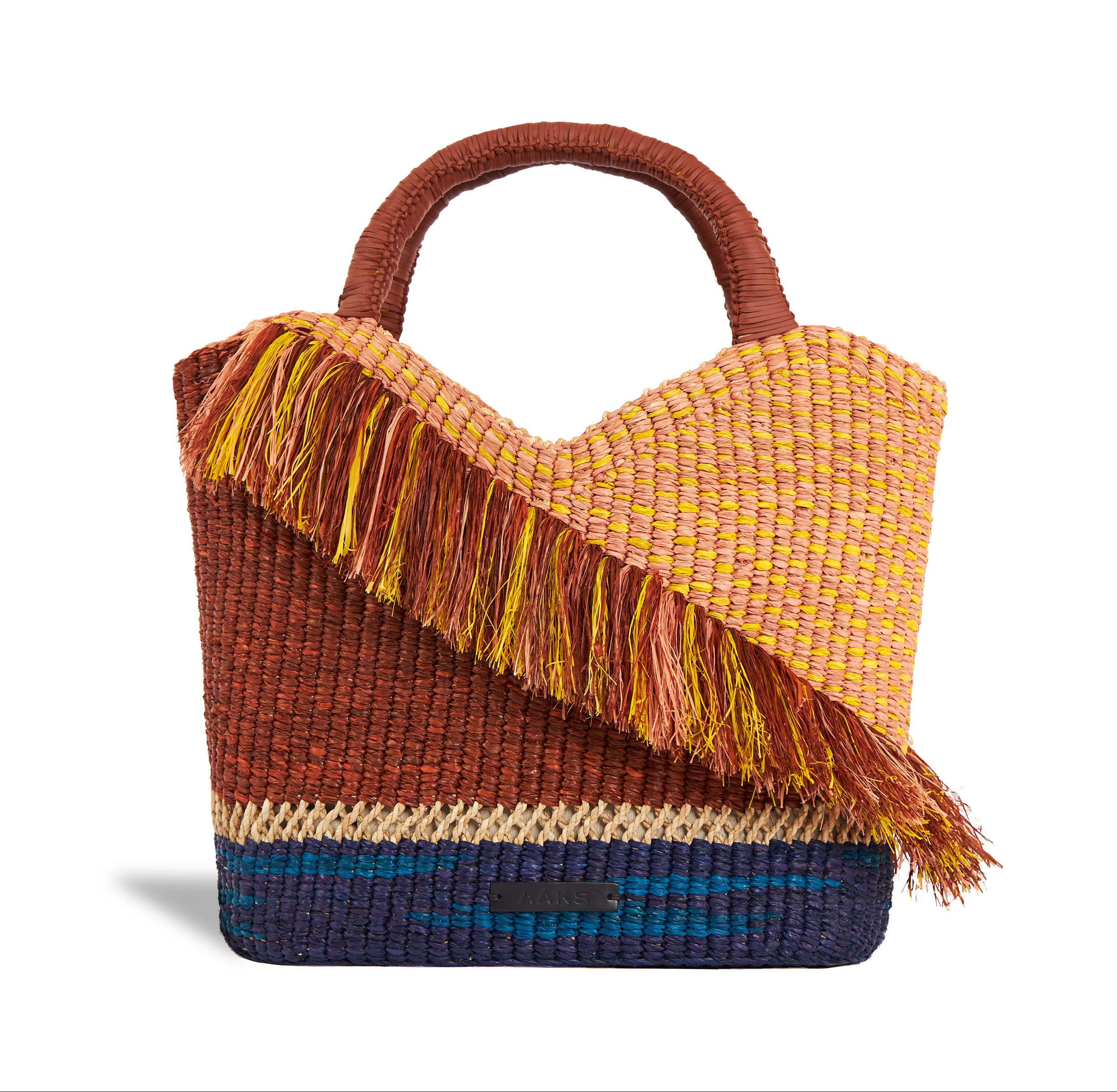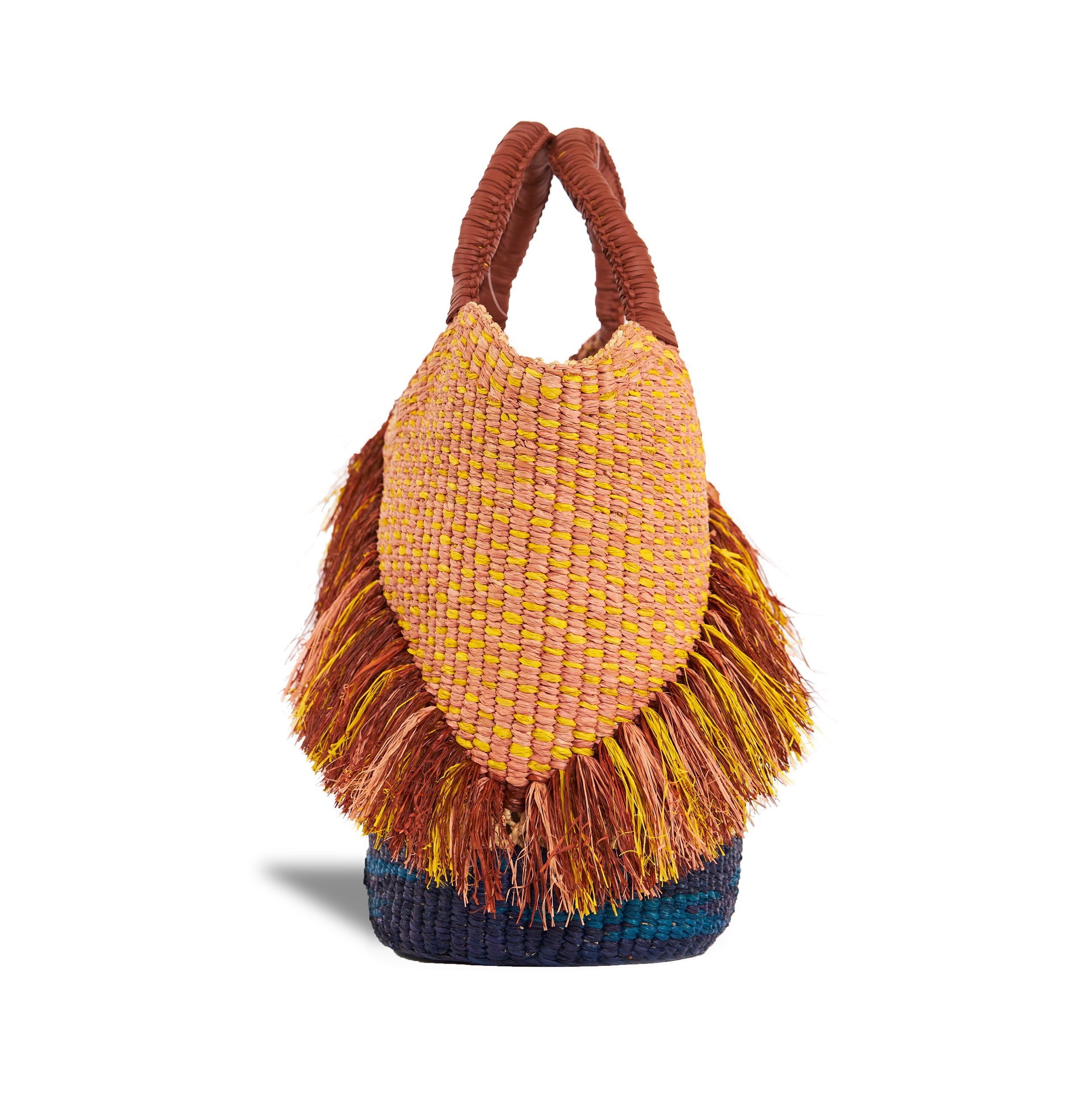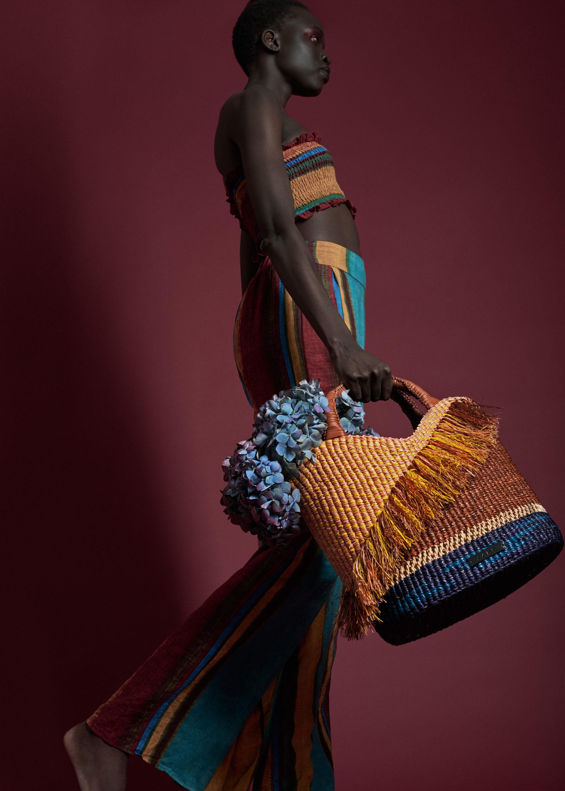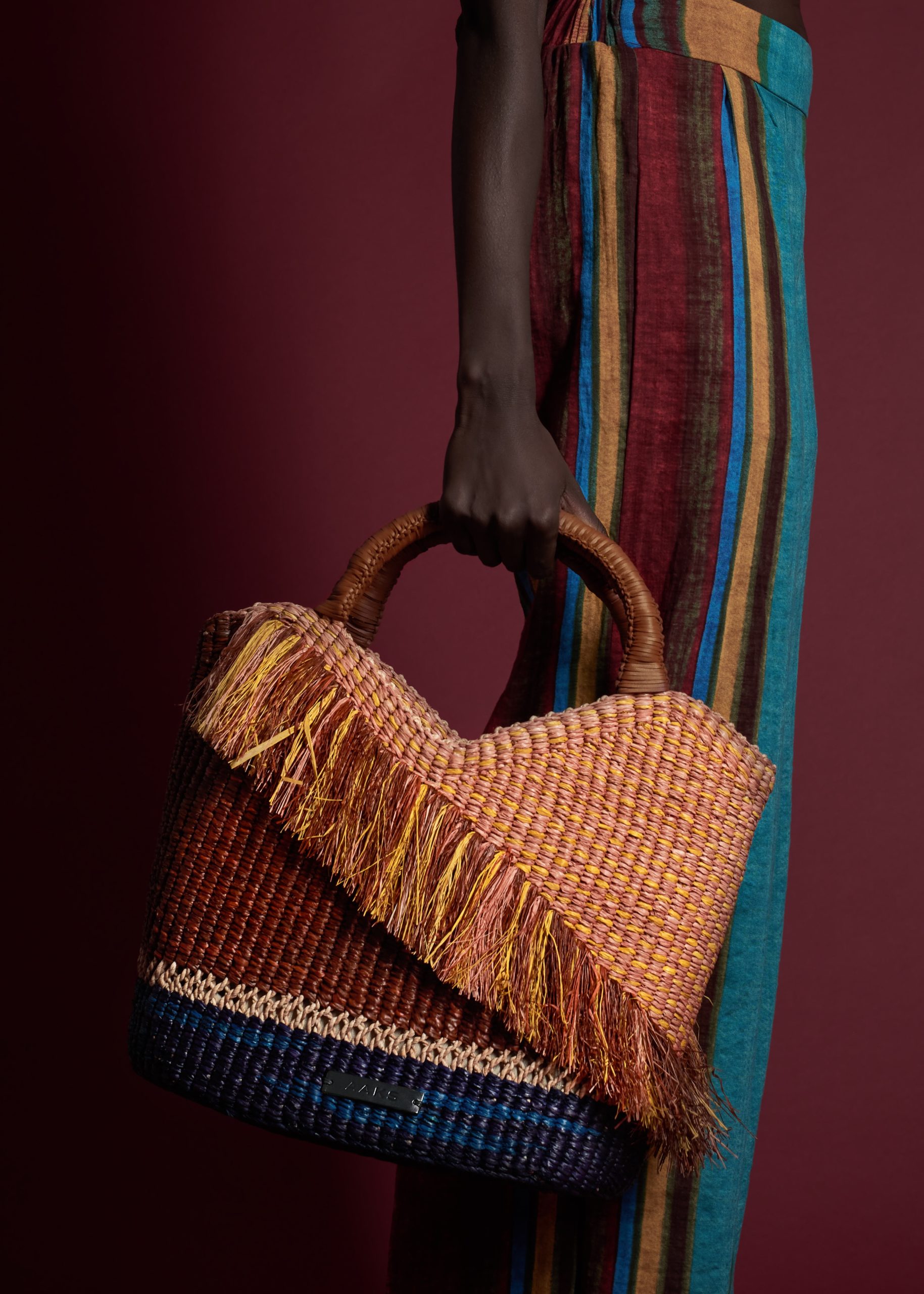 Oroo oak har et slående utseende med en romslig silhuett. Håndlaget av det bærekraftige ghanesiske luksusmerket A A K S i sammenflettet fargerik raffia, med frynser. Håndvevd av vevere i det nordlige Ghana ved bruk av tradisjonelle veveteknikker videreført fra generasjon til generasjon. Med hvert kjøp bidrar du direkte til utviklingen av vevernes samfunn i Nord-Ghana.