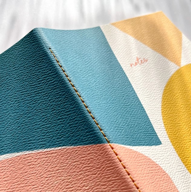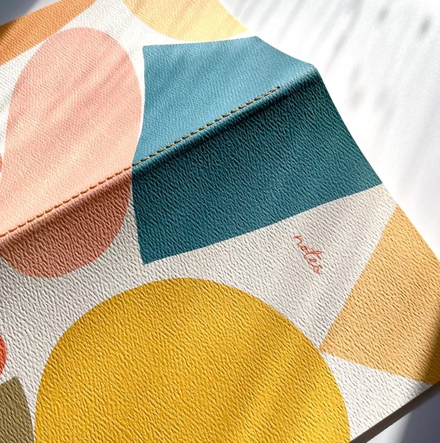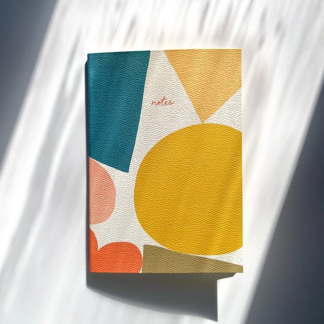 Notatbok med store abstrakte former, inneholder 60 blanke sider