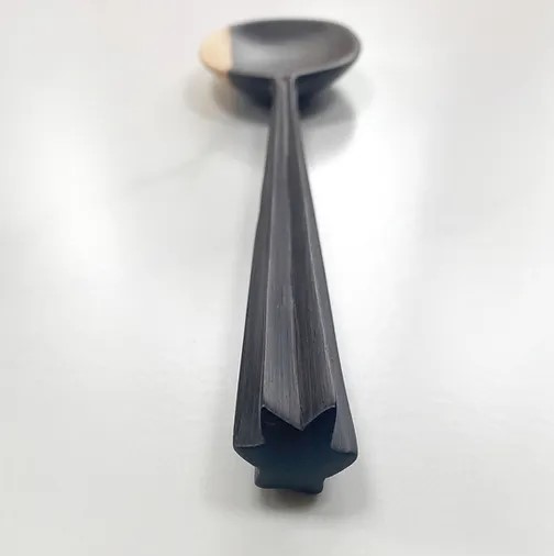 Det lange skaftet med de sirlig utskårne rillene gjør den til en praktisk skje til dypere skåler. Den er også allsidig nok til å brukes til grunne retter, og hviler vakkert på kanten.