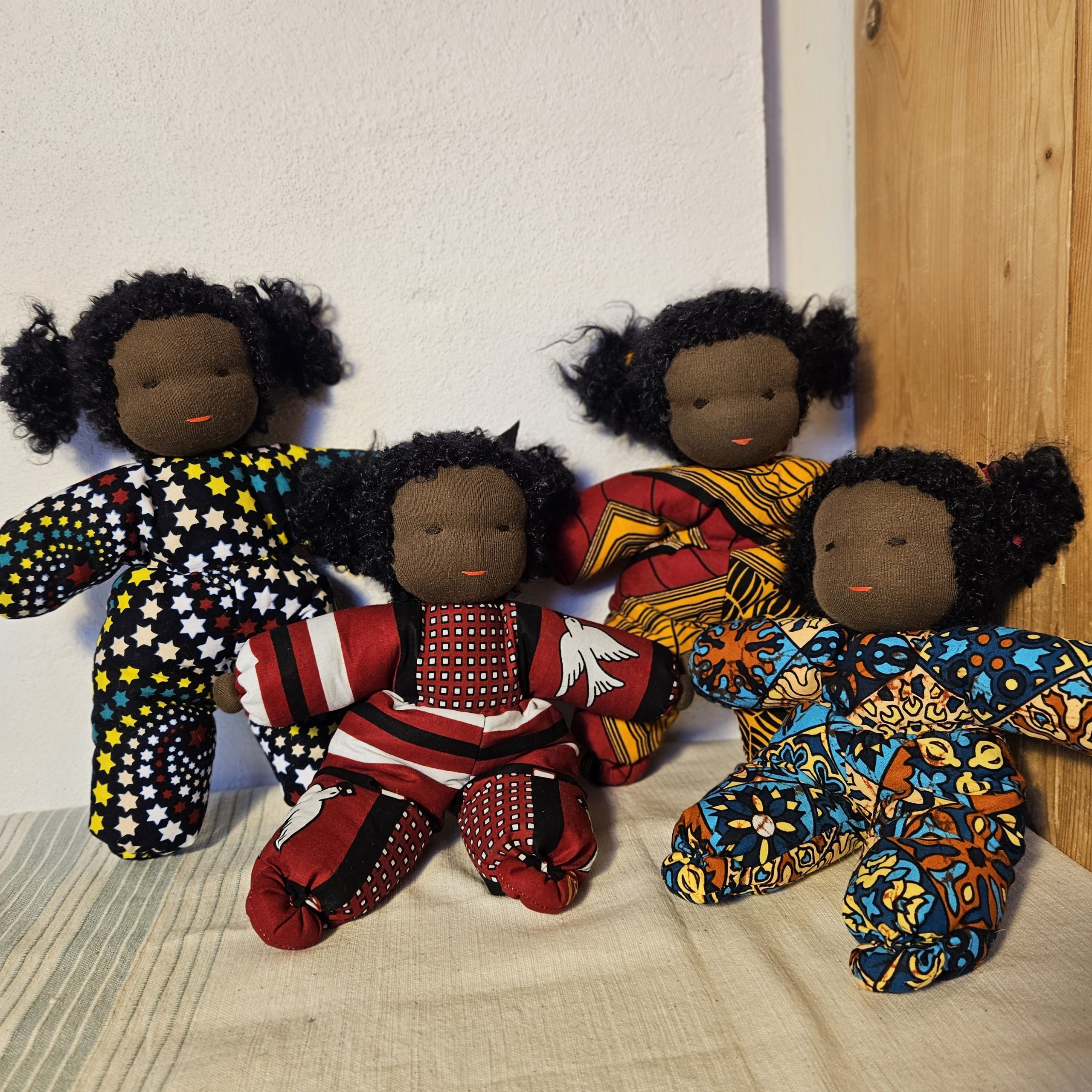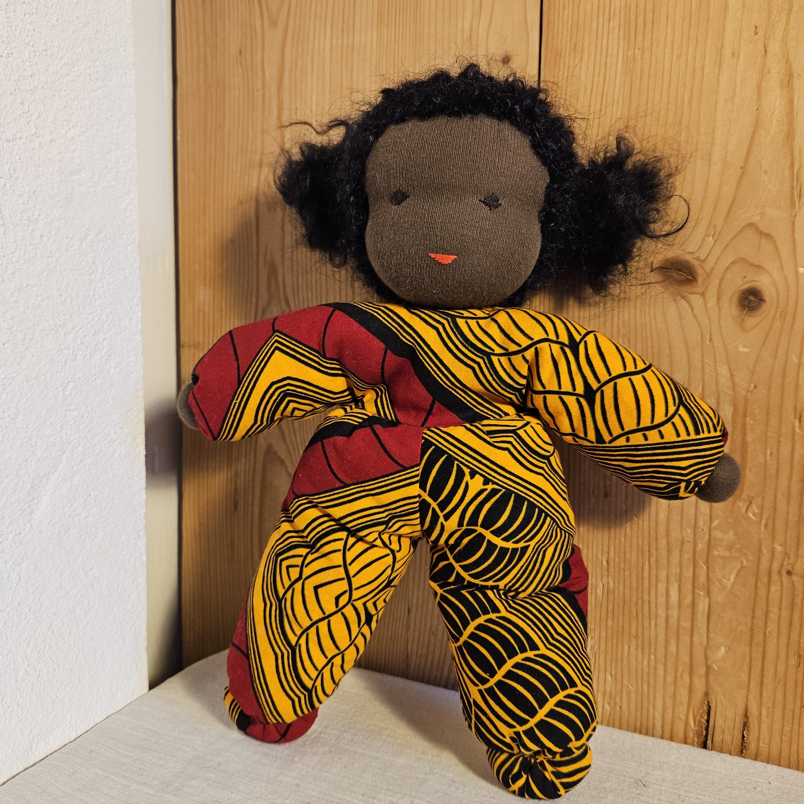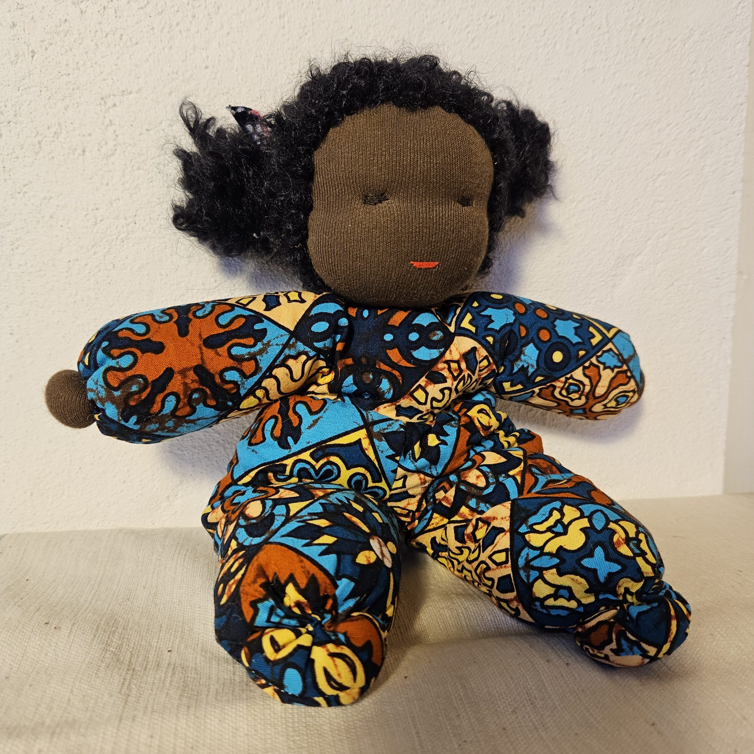 Nydelig dukke med teksturert hår og drakt i vest-afrikansk stoff. En perfekt lekekamerat og bestevenn for livet!
