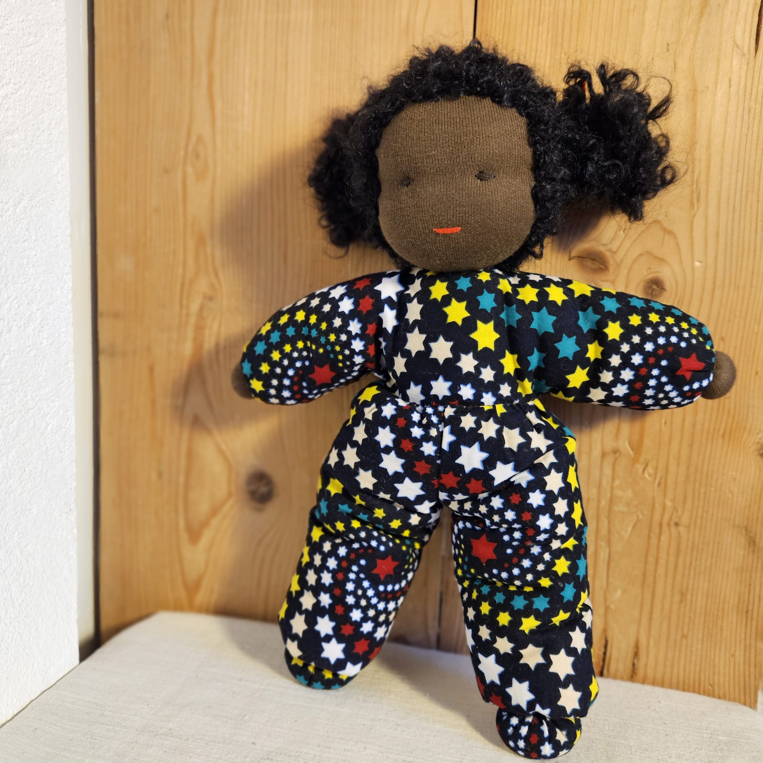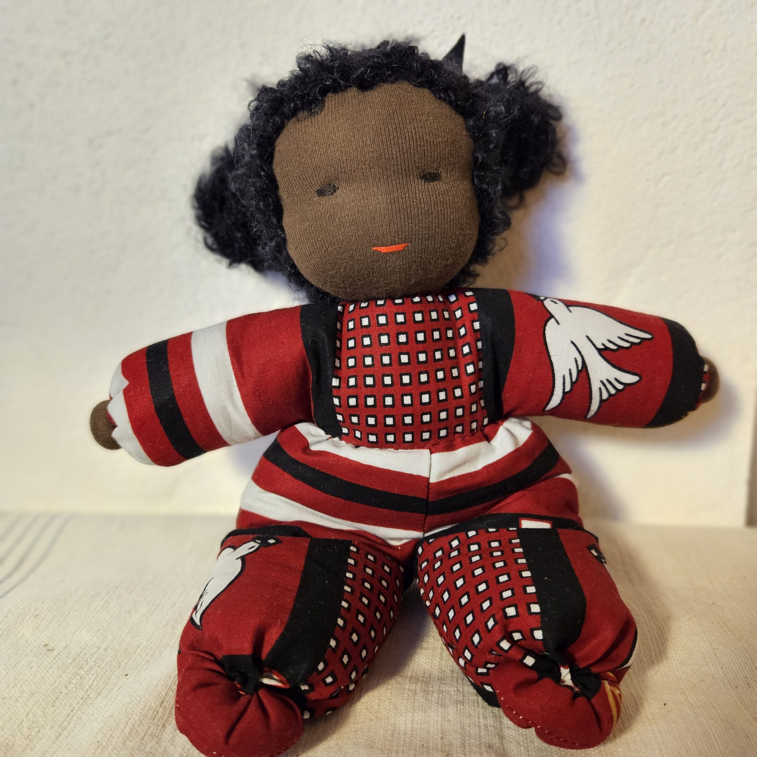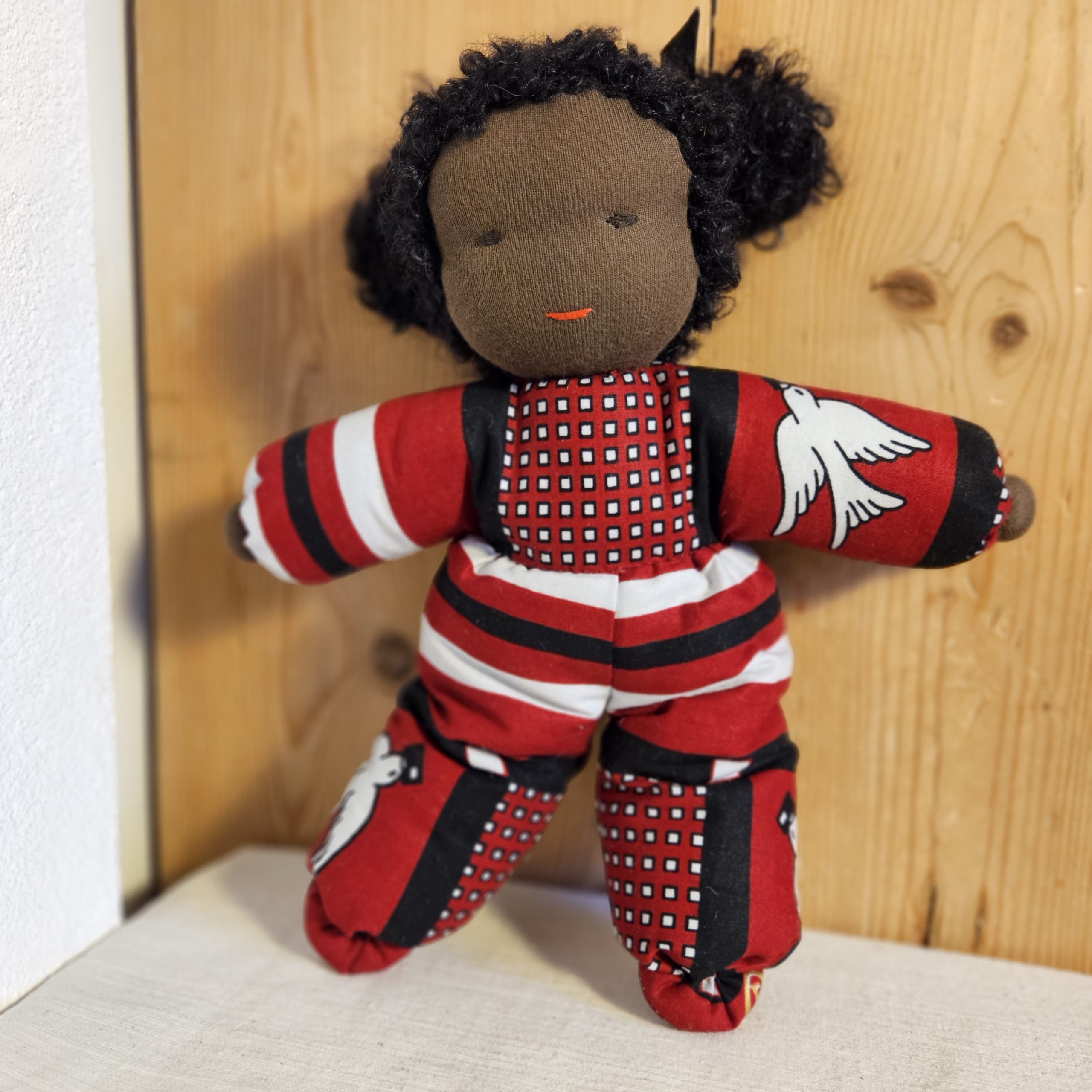 Nydelig dukke med teksturert hår og drakt i vest-afrikansk stoff. En perfekt lekekamerat og bestevenn for livet!