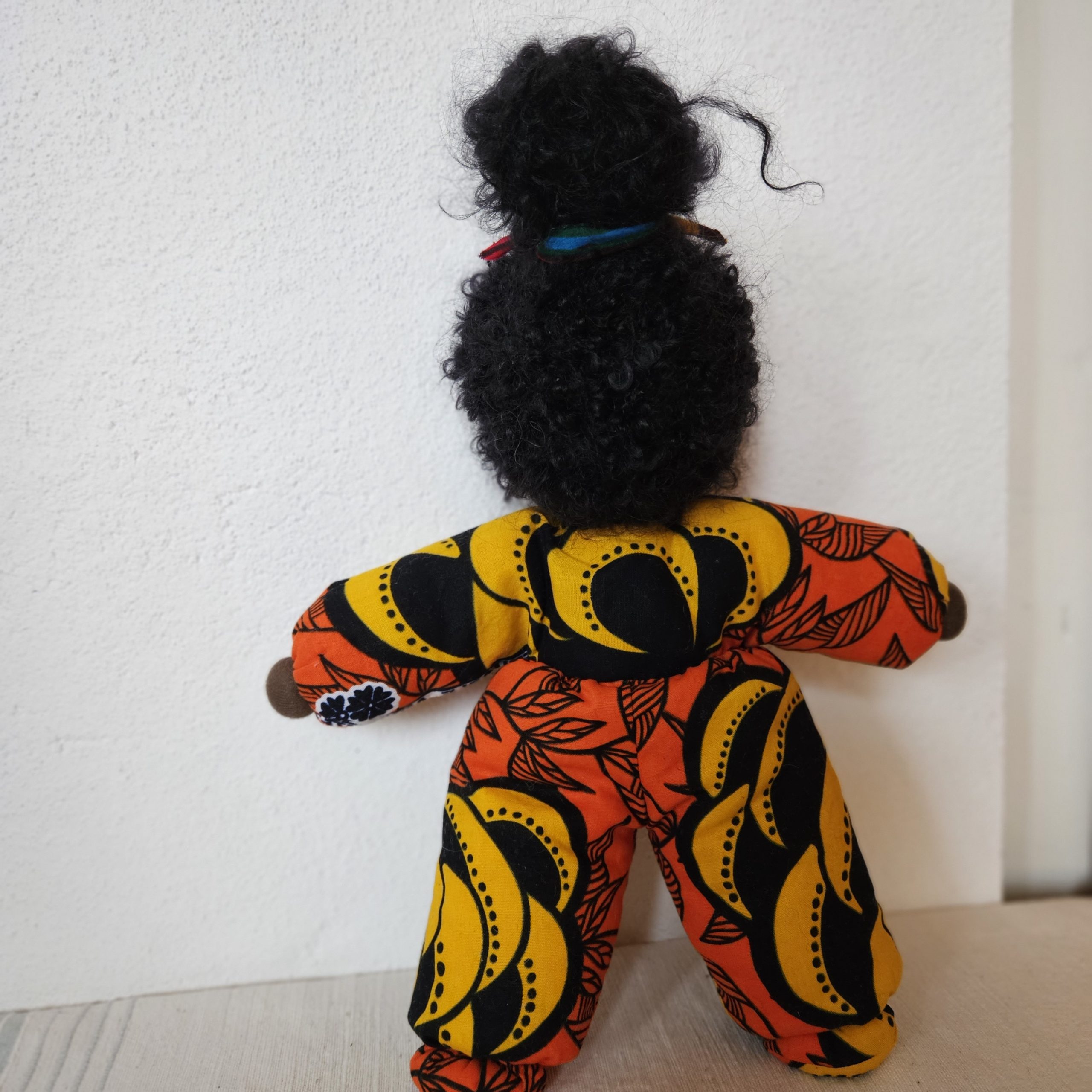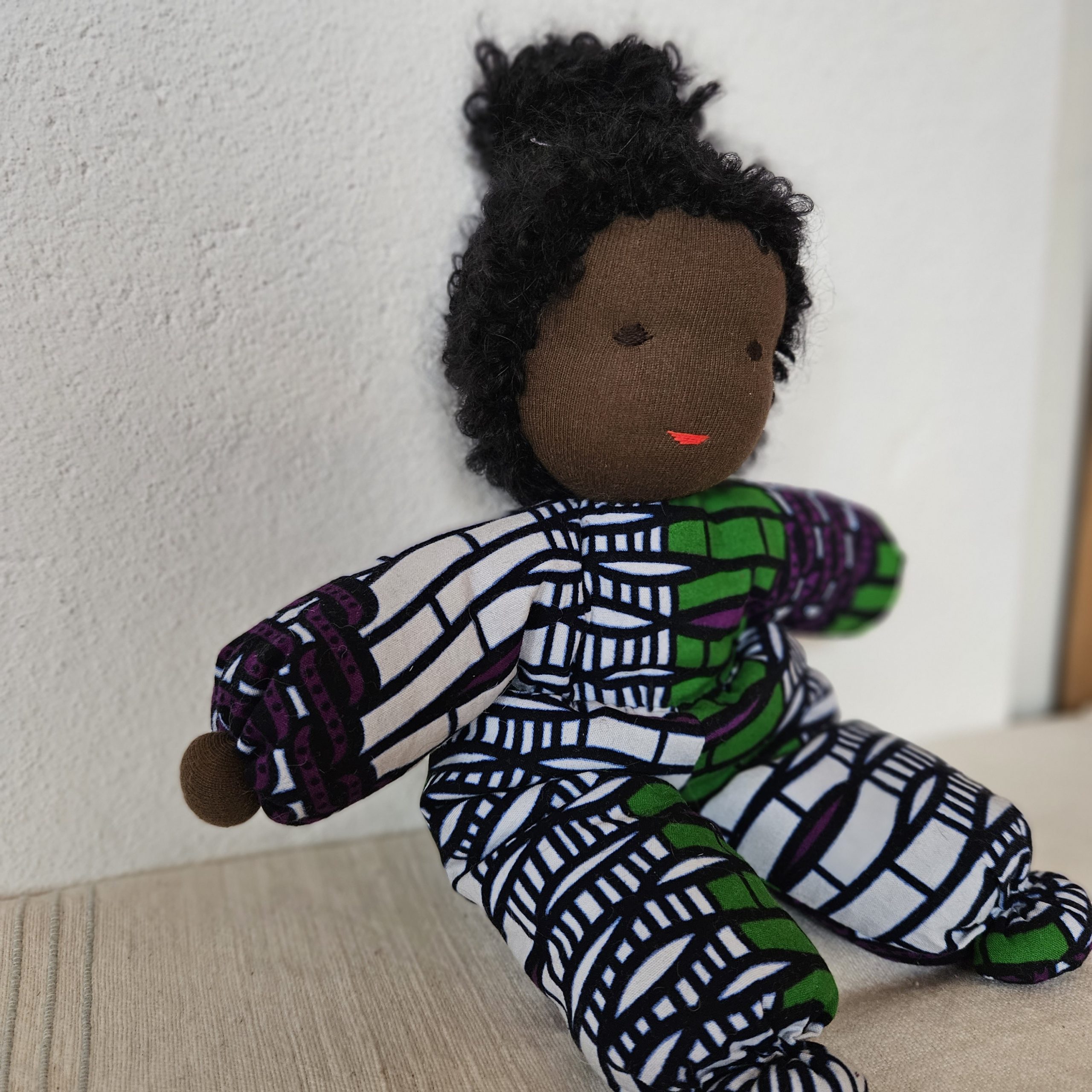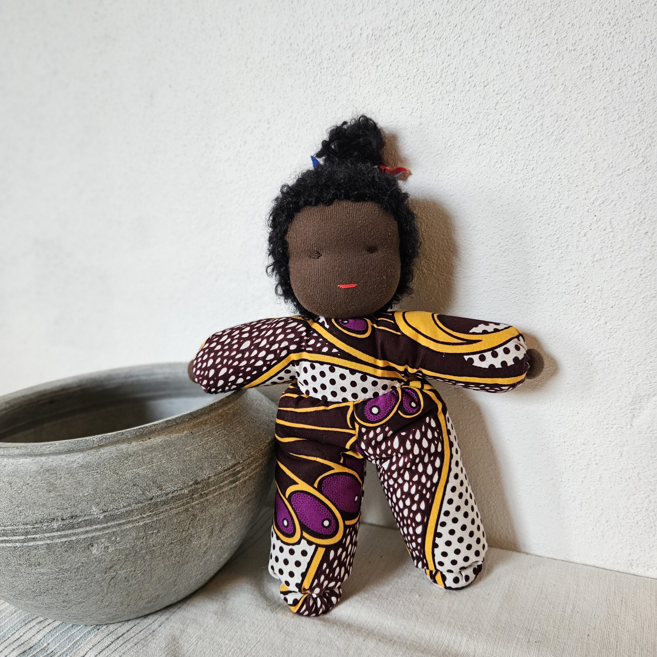 En super søt dukke med nydelig teksturert hår og drakt i vest-afrikansk stoff. En perfekt lekekamerat og bestevenn for livet!