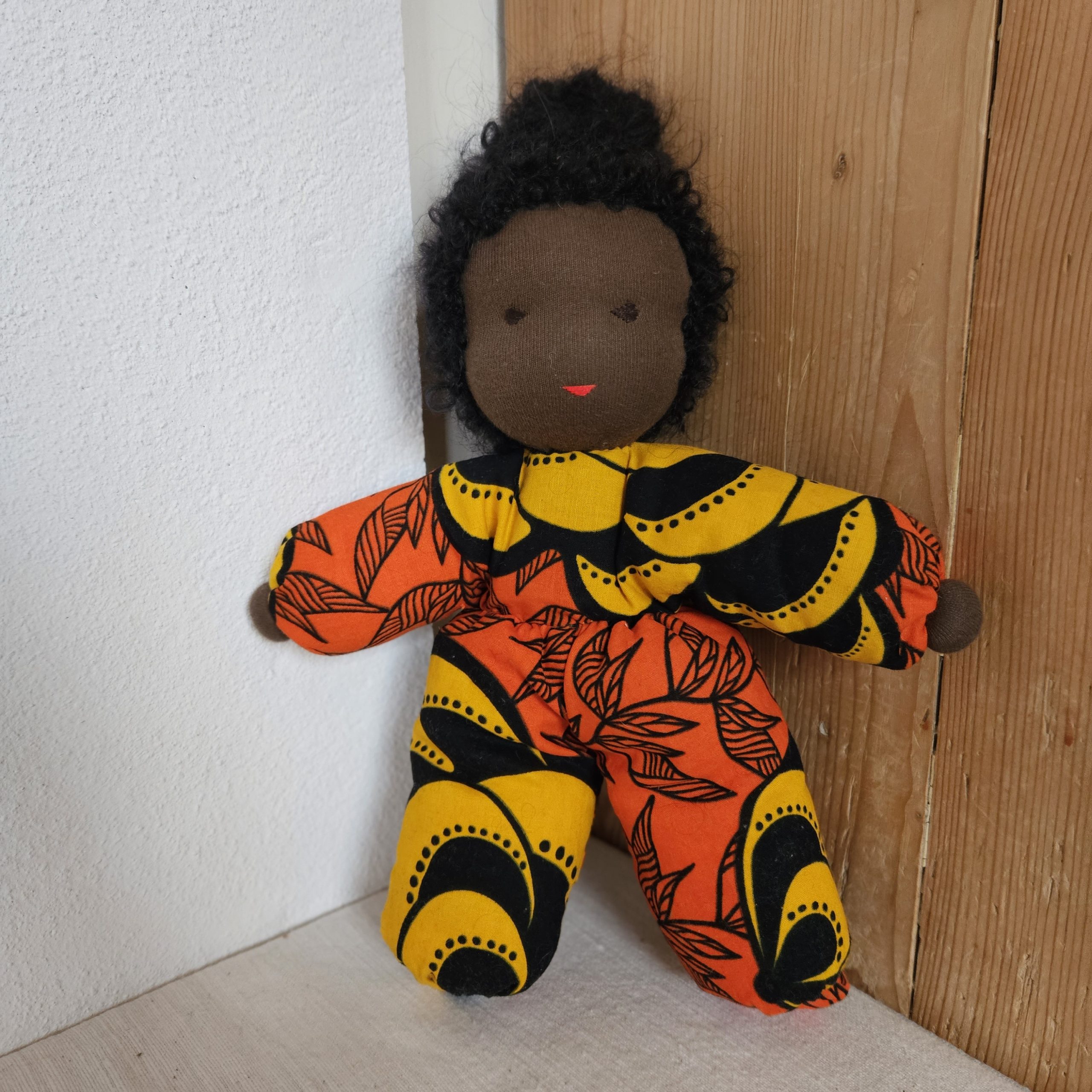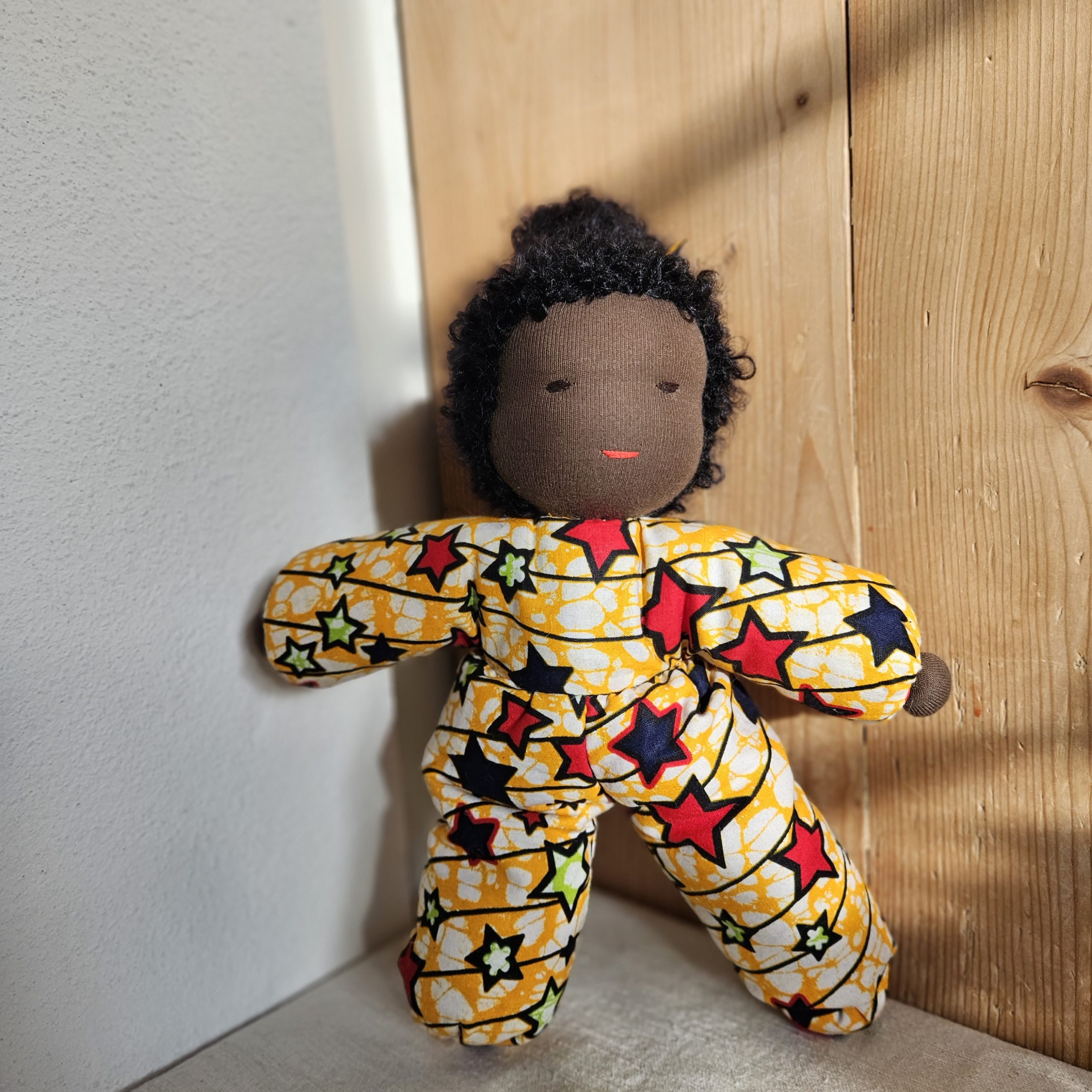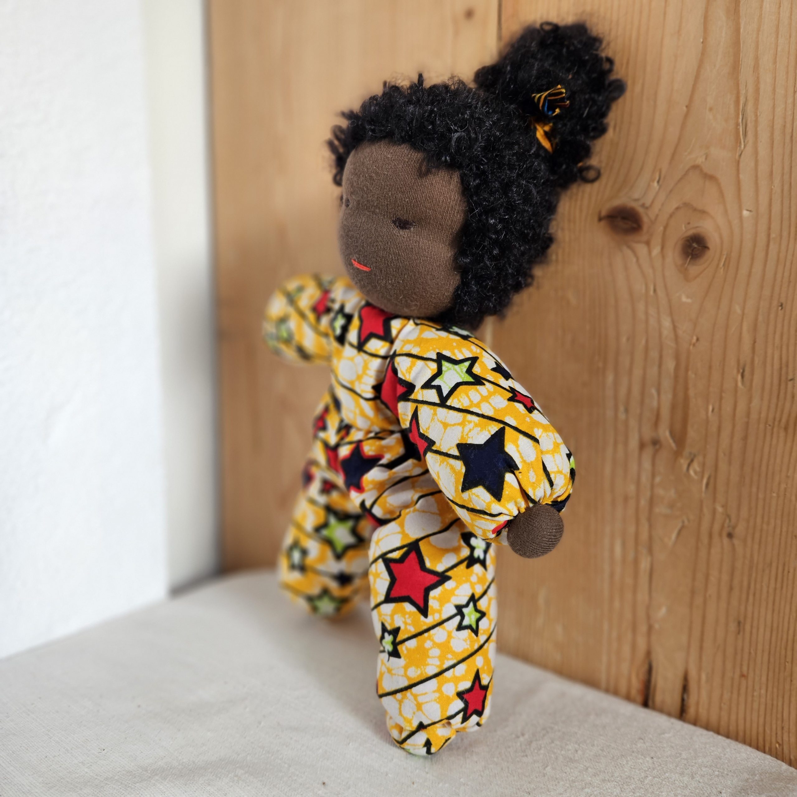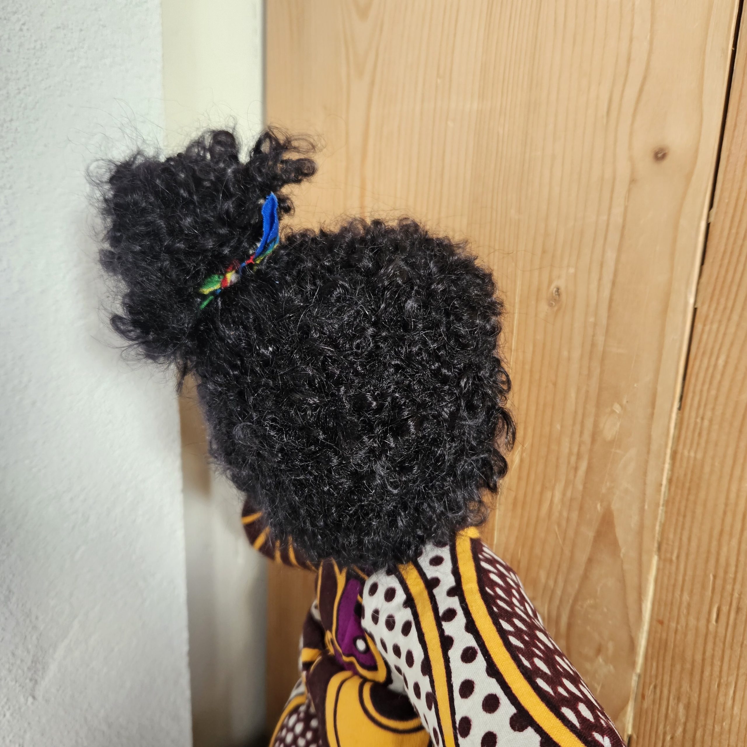 En super søt dukke med nydelig teksturert hår og drakt i vest-afrikansk stoff. En perfekt lekekamerat og bestevenn for livet!