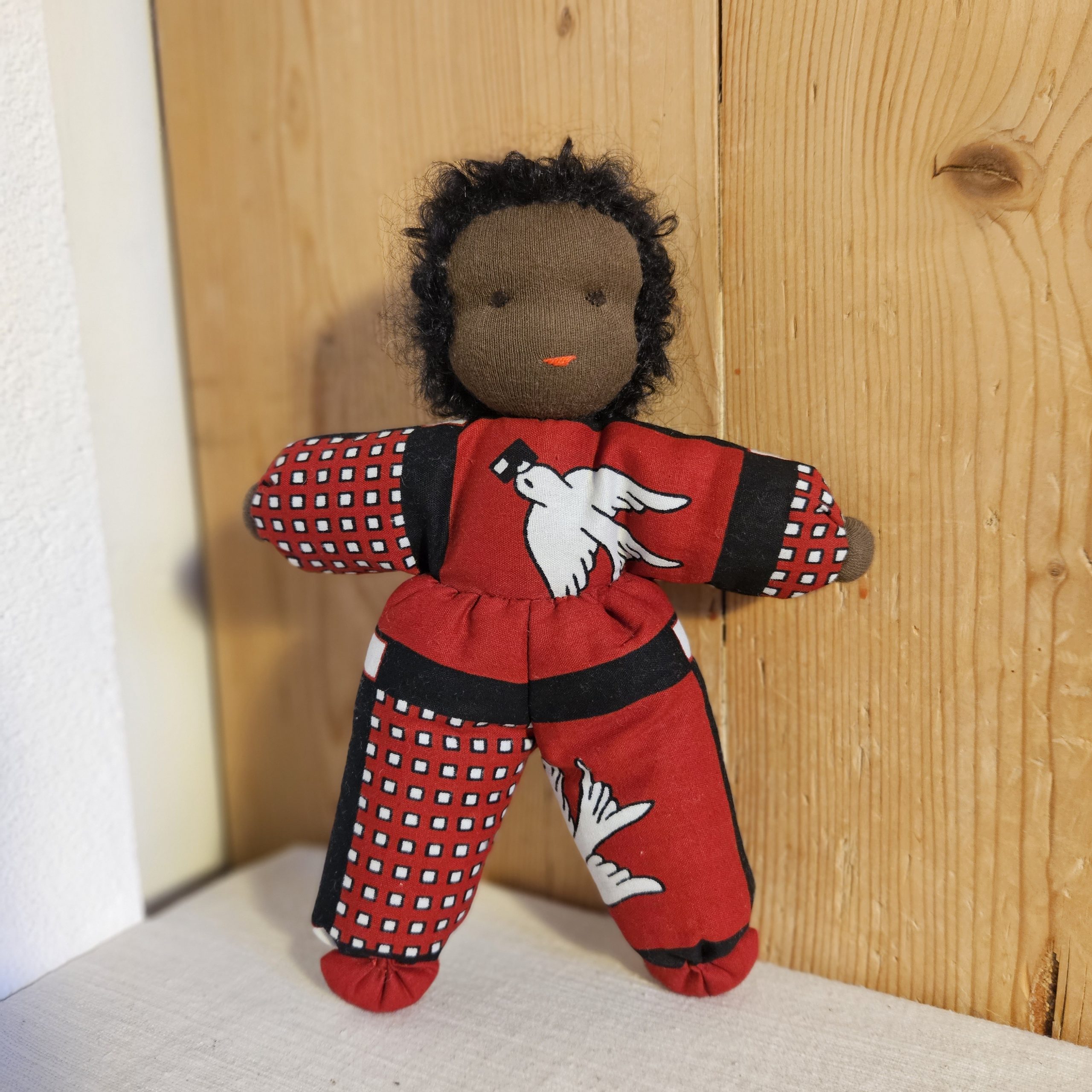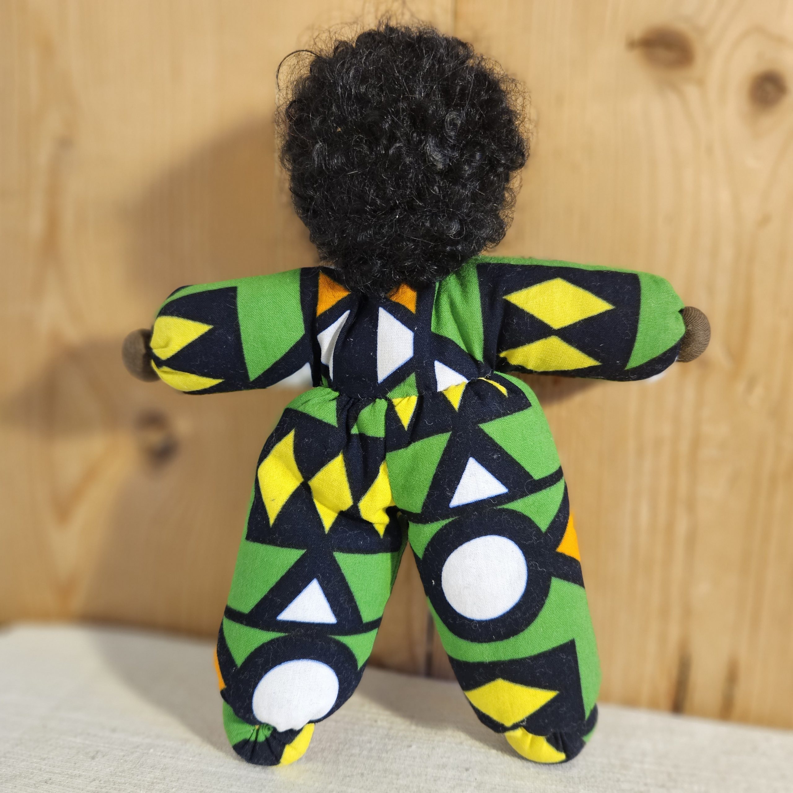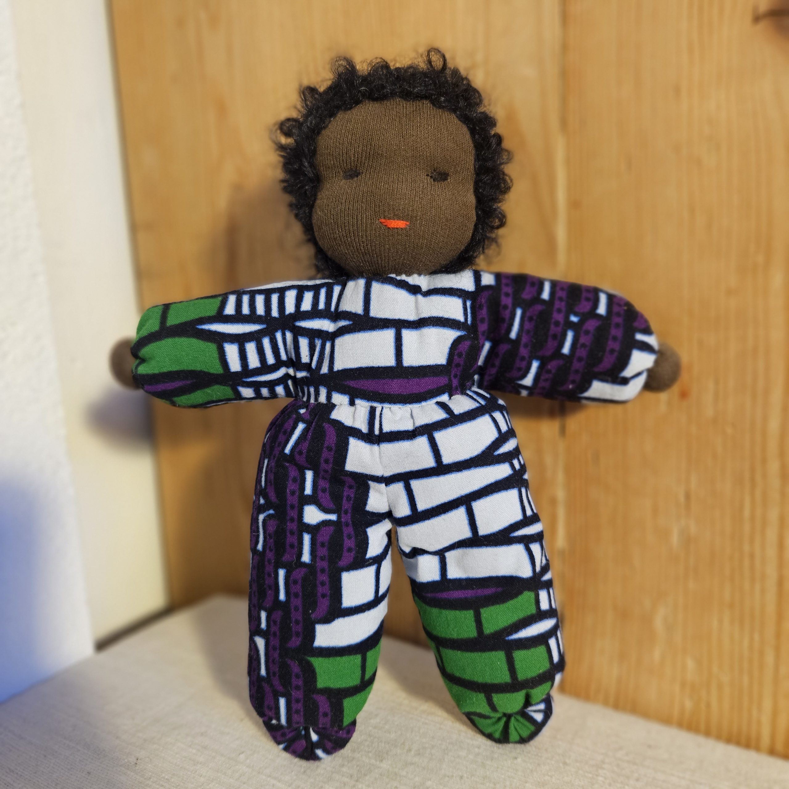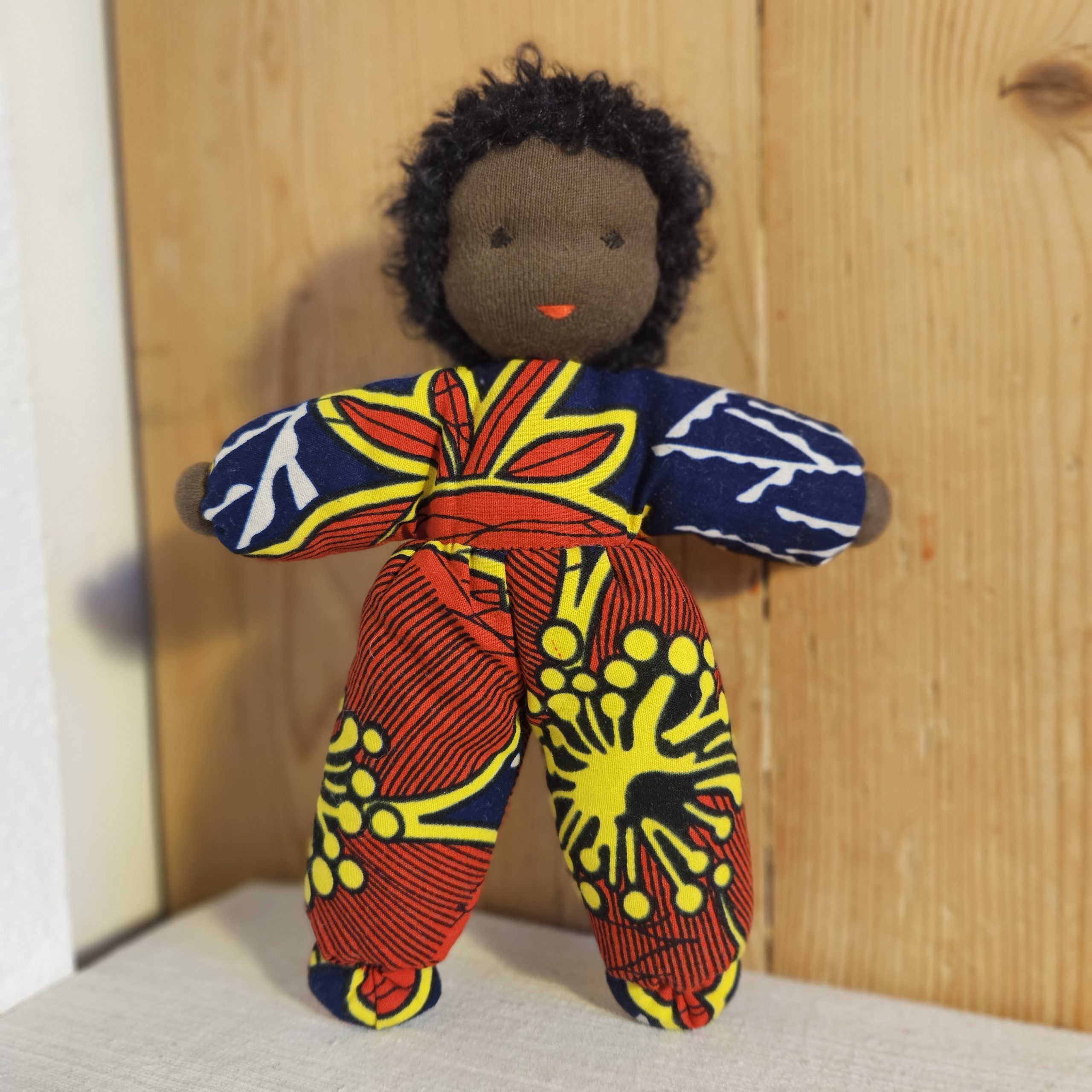 Dukke med nydelig teksturert hår og drakt i vest-afrikansk stoff. En perfekt lekekamerat og bestevenn for livet!