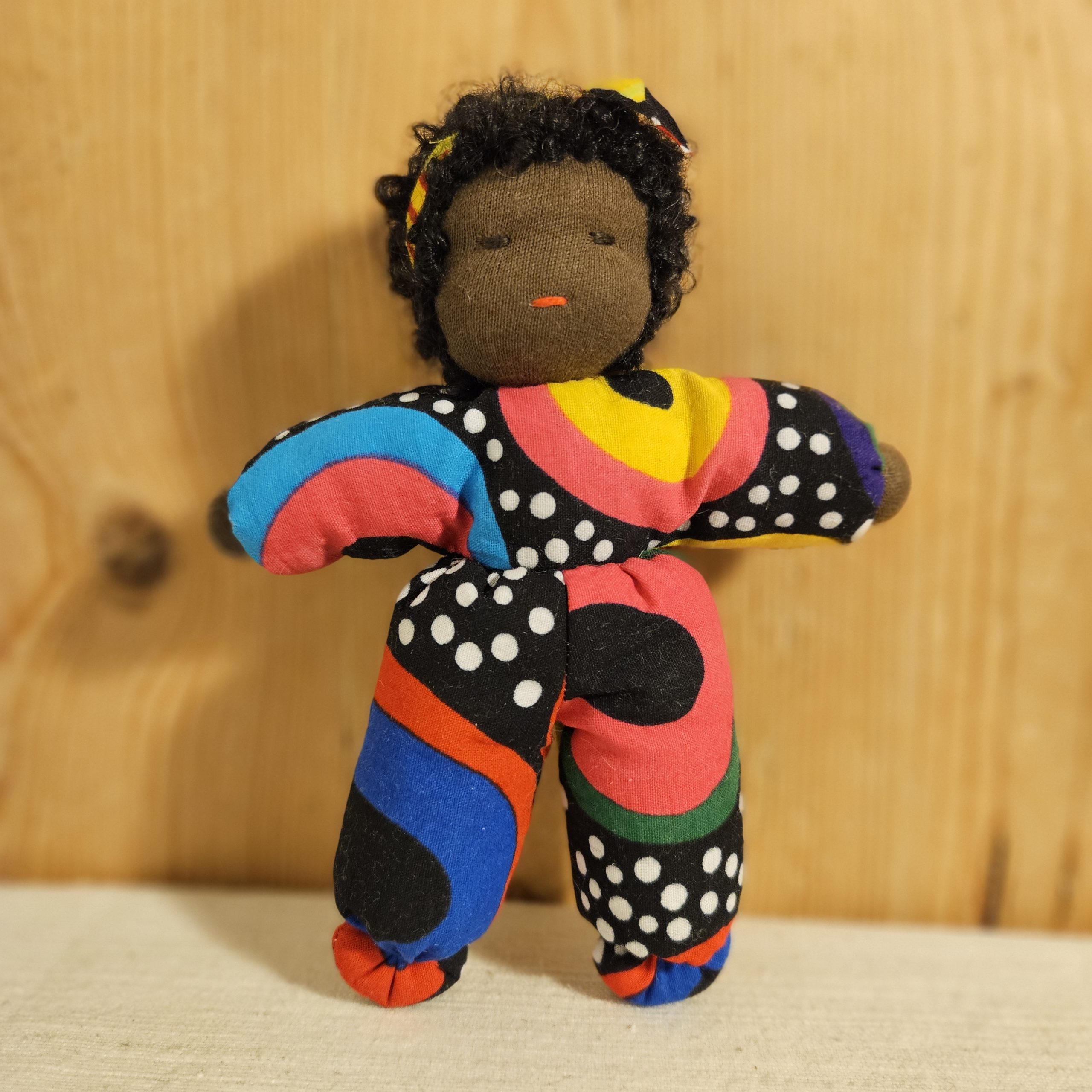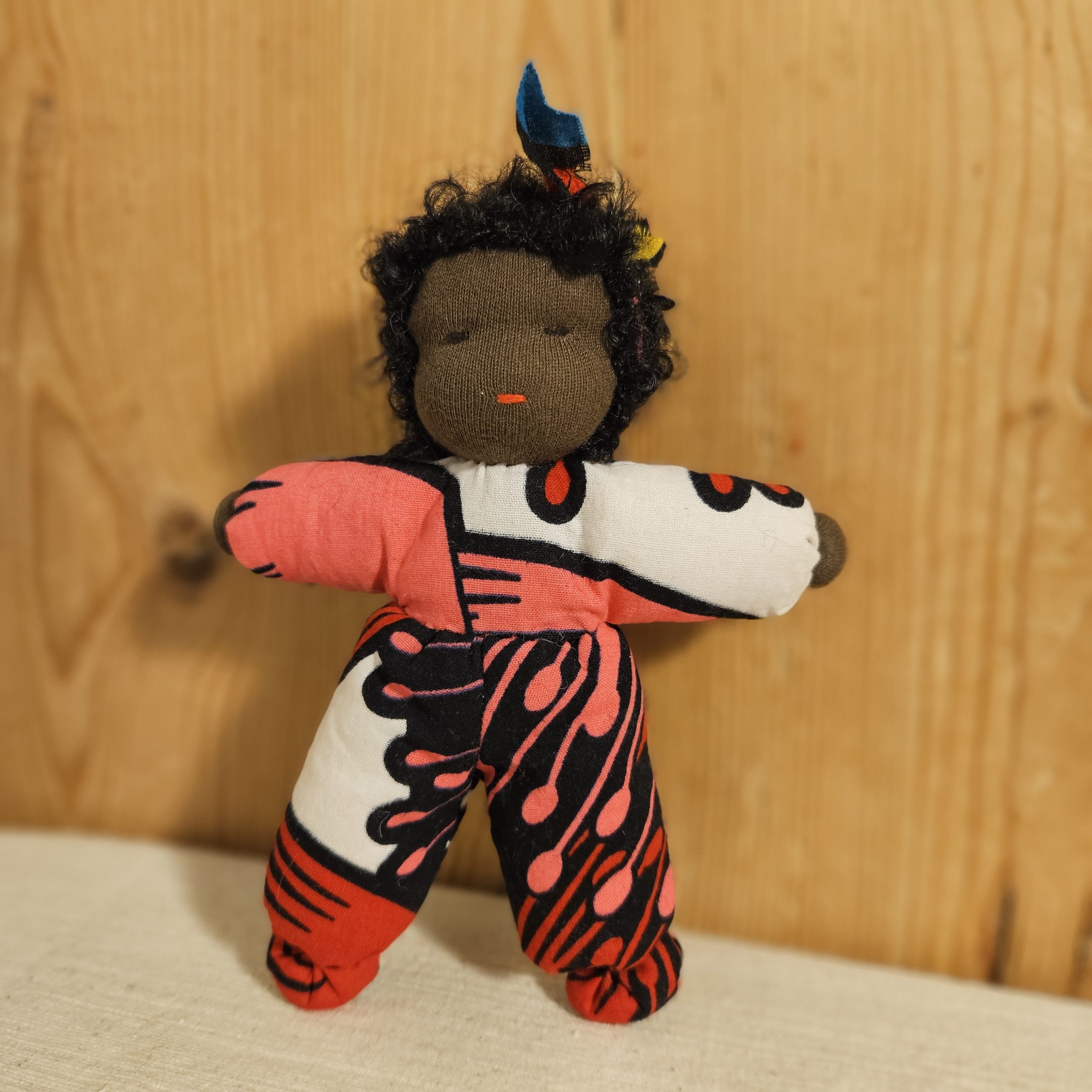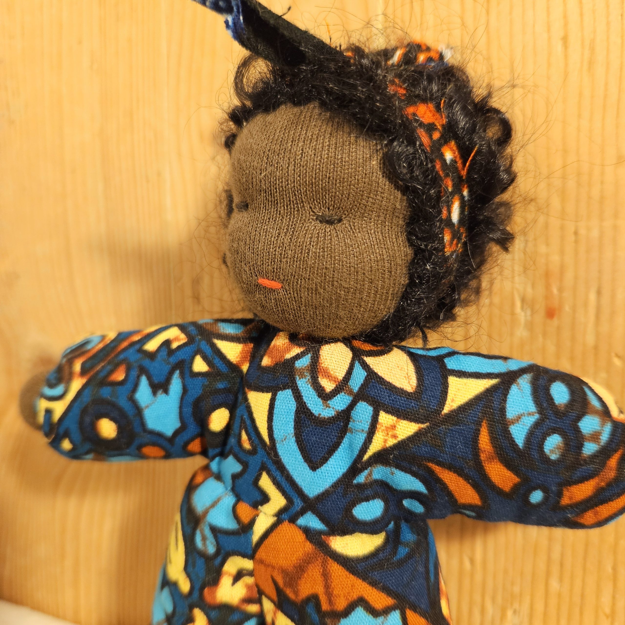 Dukke med nydelig teksturert hår og drakt i vest-afrikansk stoff. En perfekt lekekamerat og bestevenn for livet!
