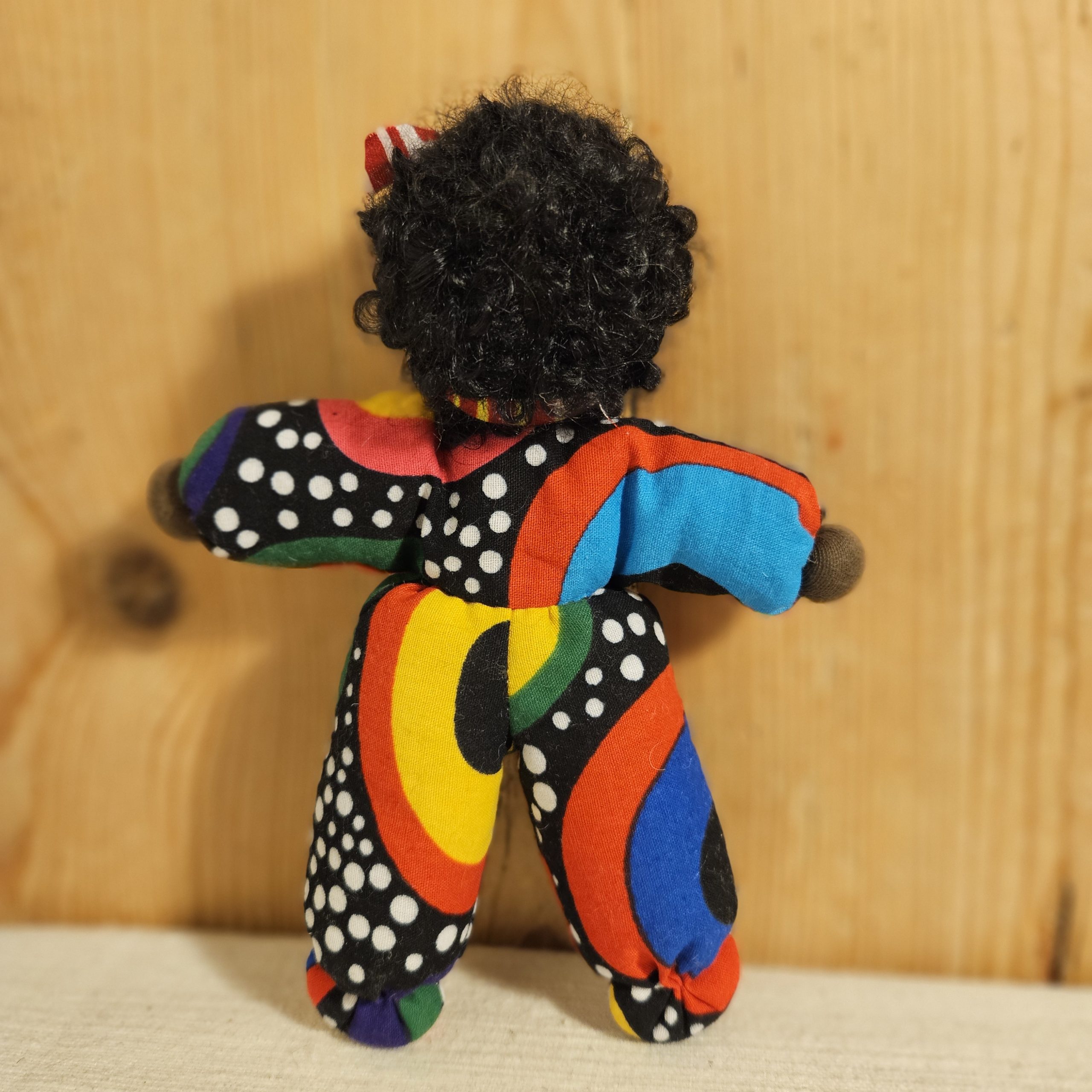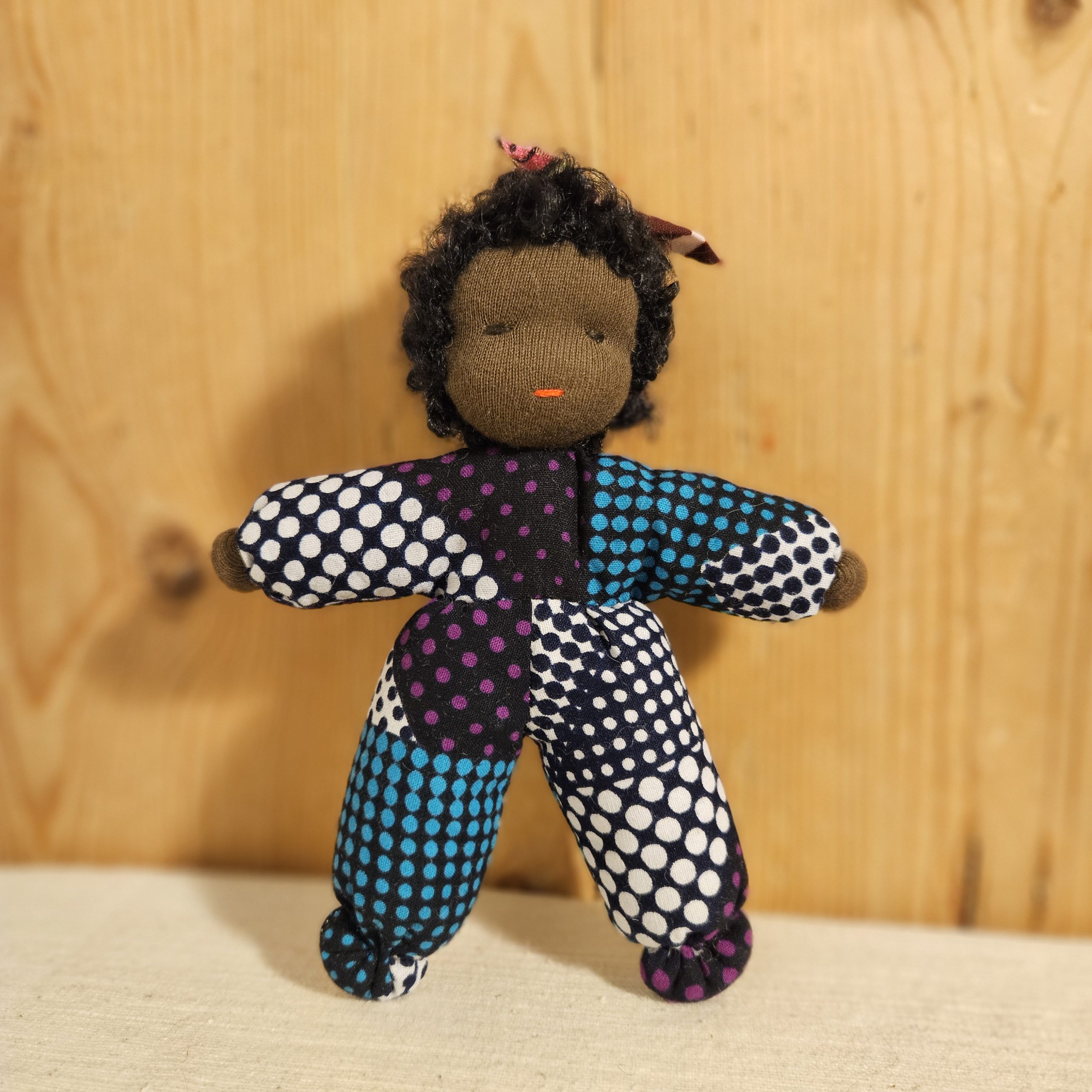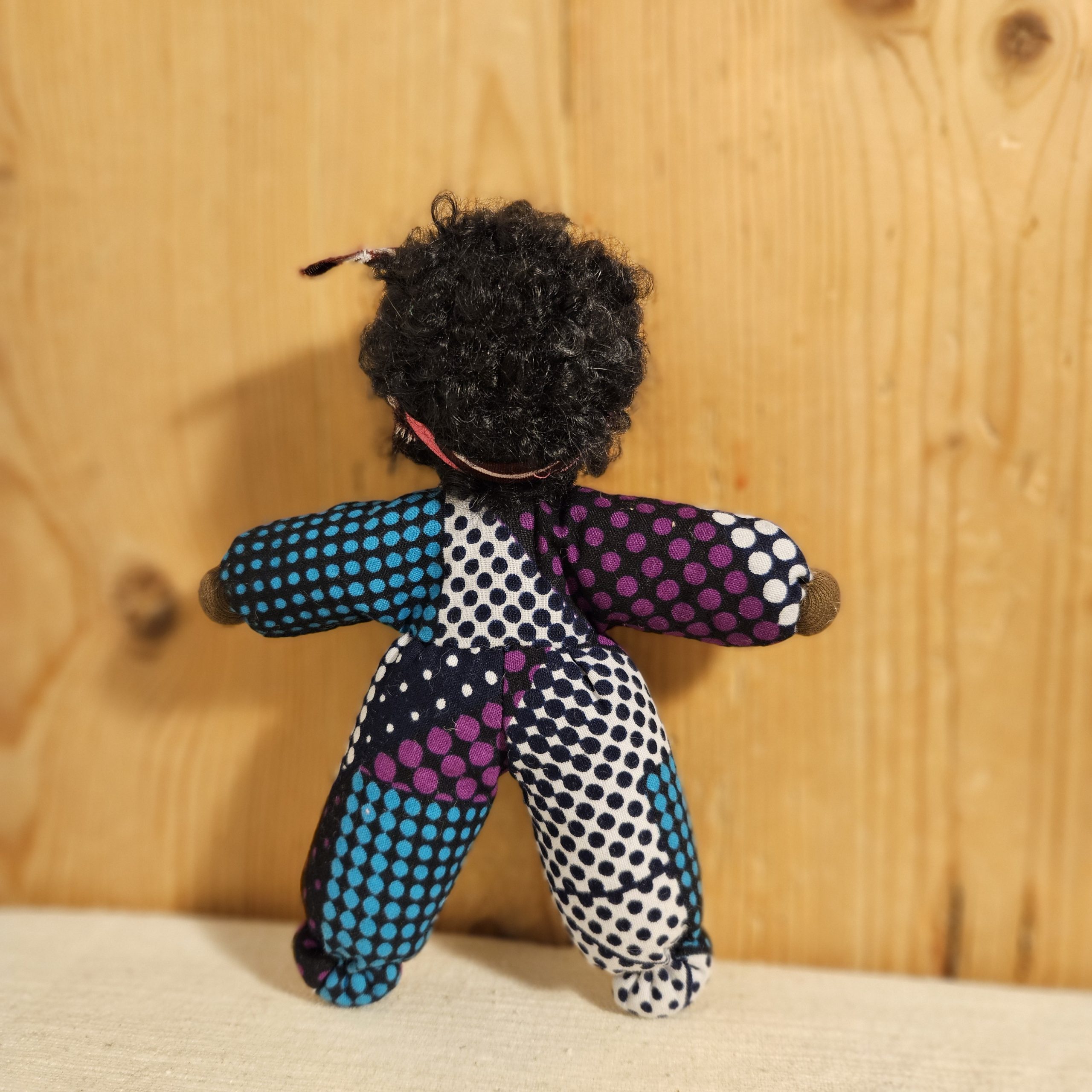 Dukke med nydelig teksturert hår og drakt i vest-afrikansk stoff. En perfekt lekekamerat og bestevenn for livet!