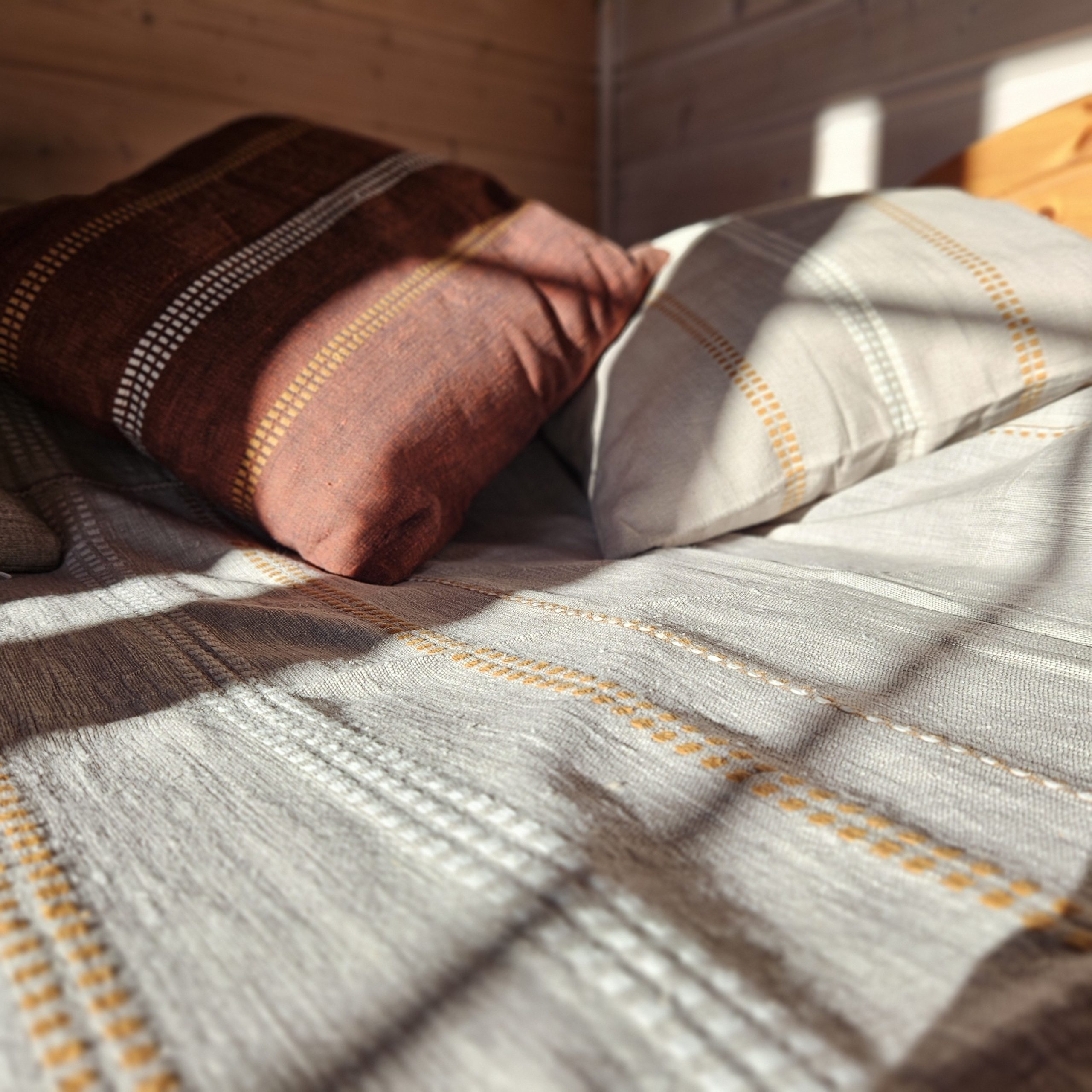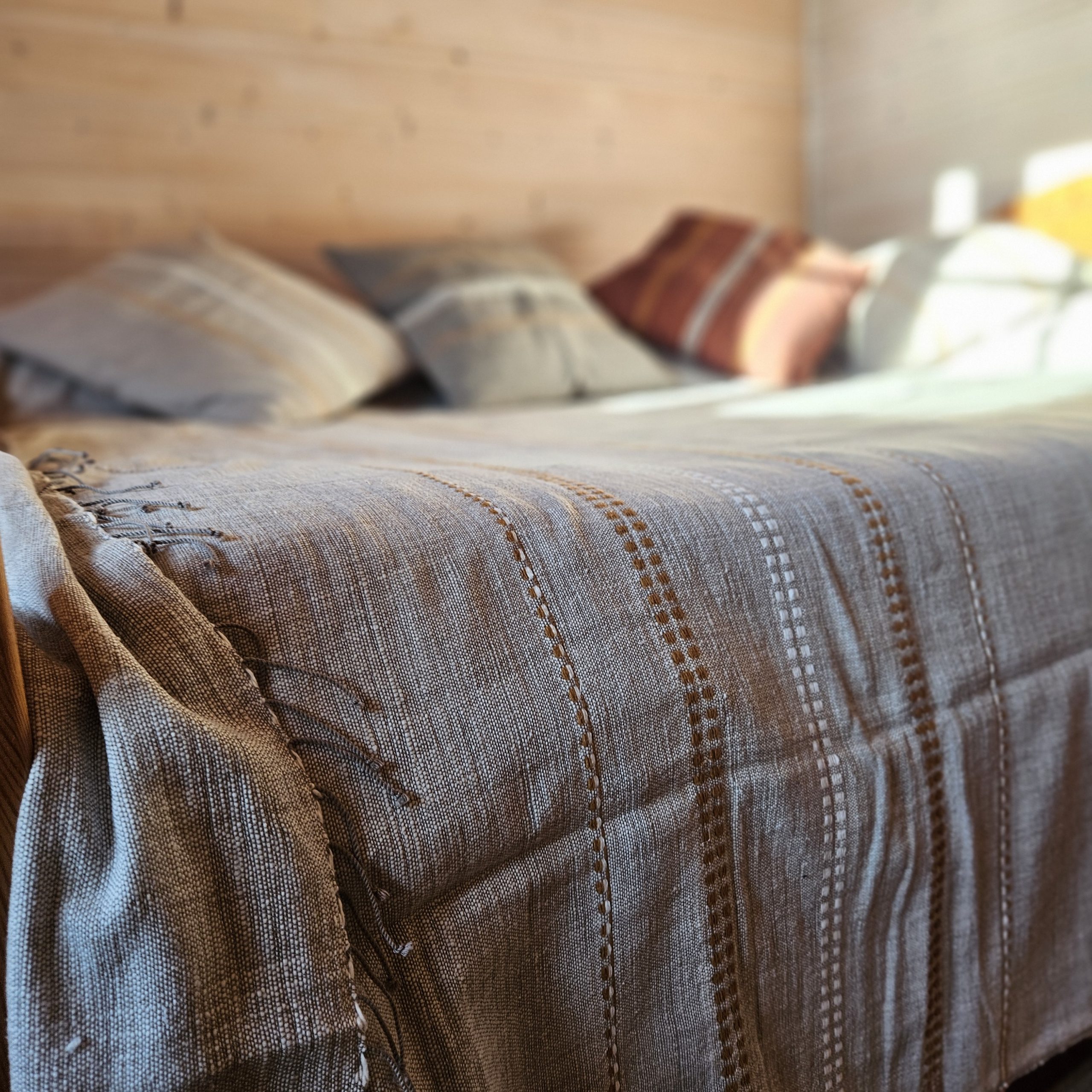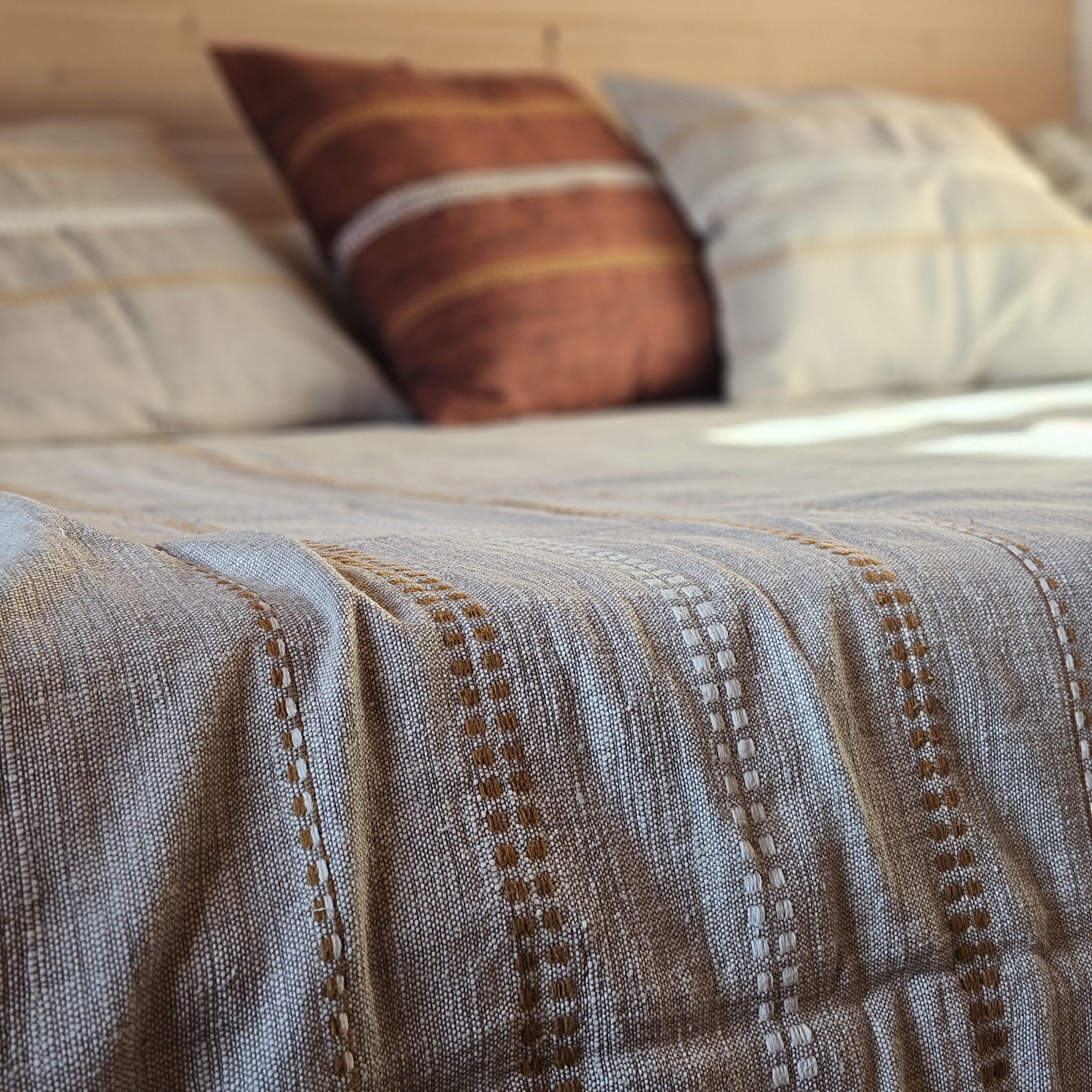 Zinach-sengeteppet har et tradisjonelt etiopisk design. Bomullen er håndspunnet, farget i små partier og vevd på en av de store vevstolene i Sabahar-verkstedet. Pleddet er avsluttet med Sabahars karakteristiske vridde frynser. Passer veldig fint sammen med Zinach-putetrekk.