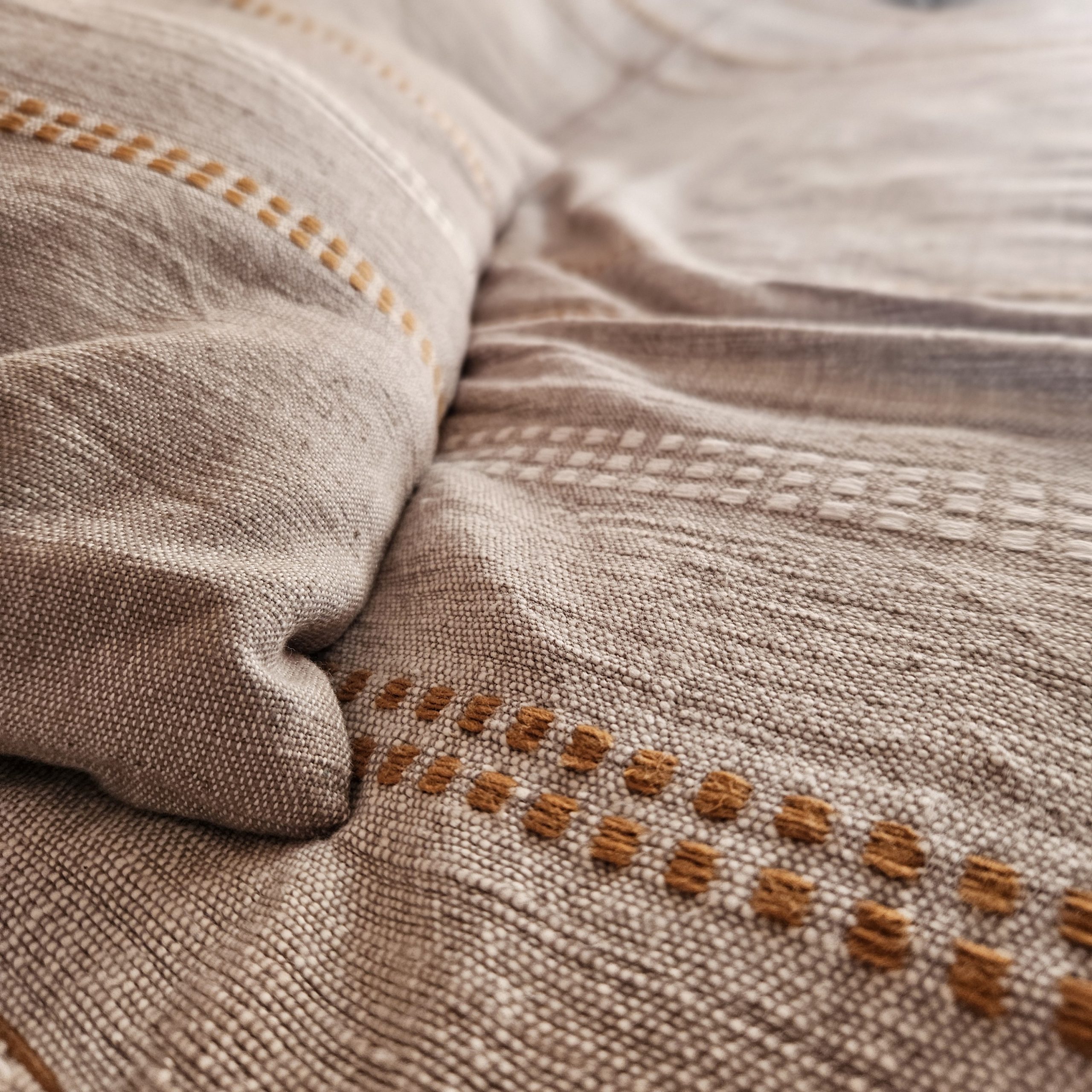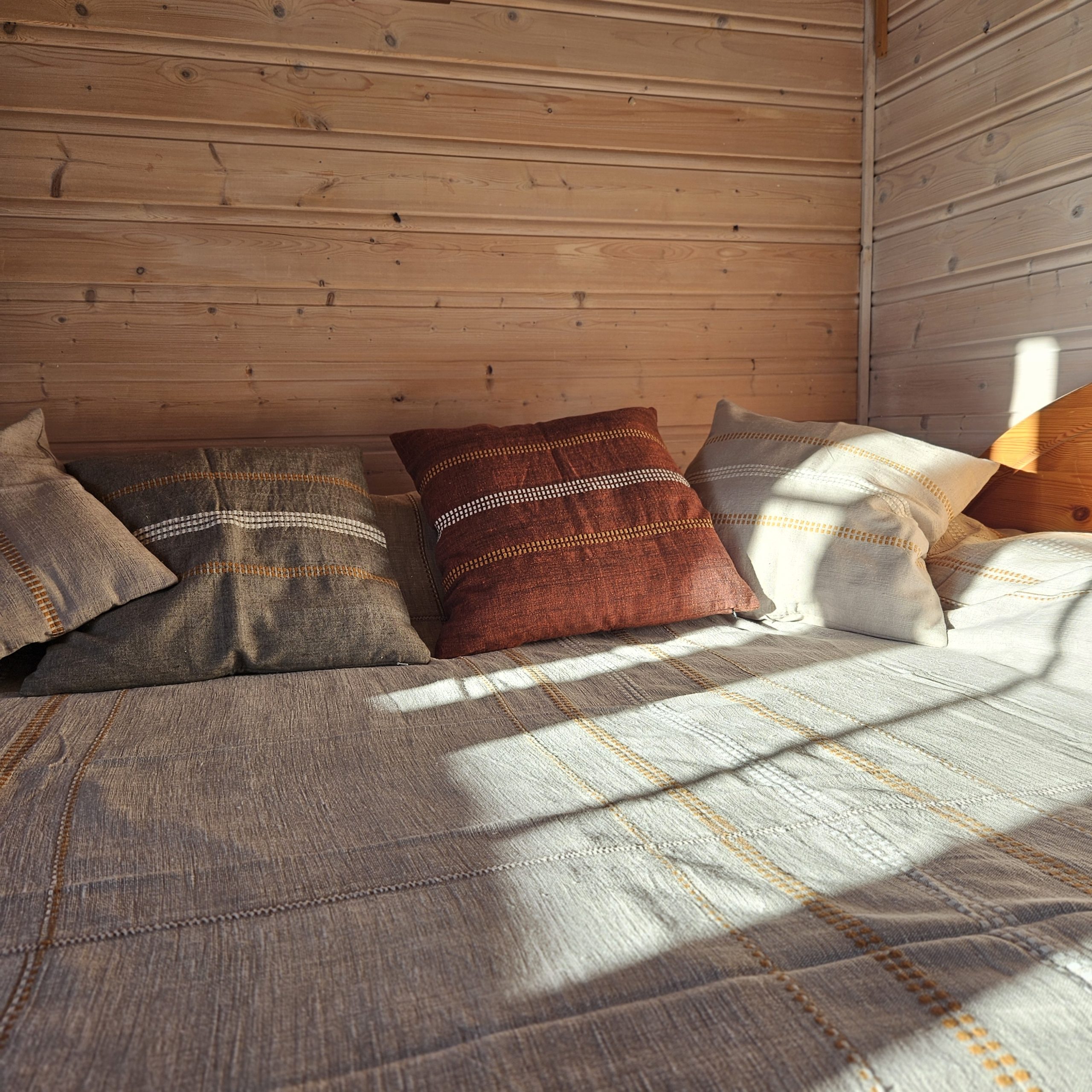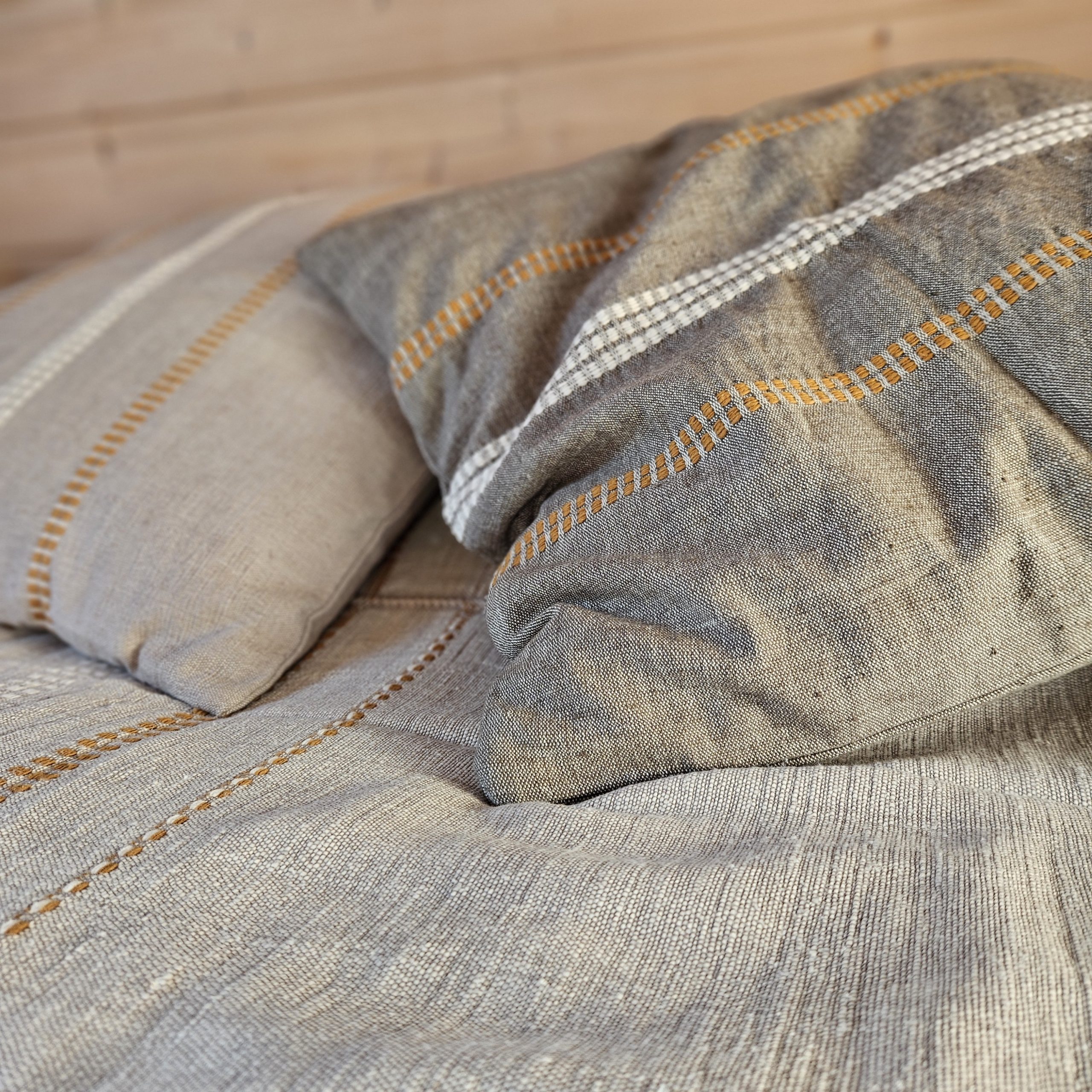 Zinach-sengeteppet har et tradisjonelt etiopisk design. Bomullen er håndspunnet, farget i små partier og vevd på en av de store vevstolene i Sabahar-verkstedet. Pleddet er avsluttet med Sabahars karakteristiske vridde frynser. Passer veldig fint sammen med Zinach-putetrekk.